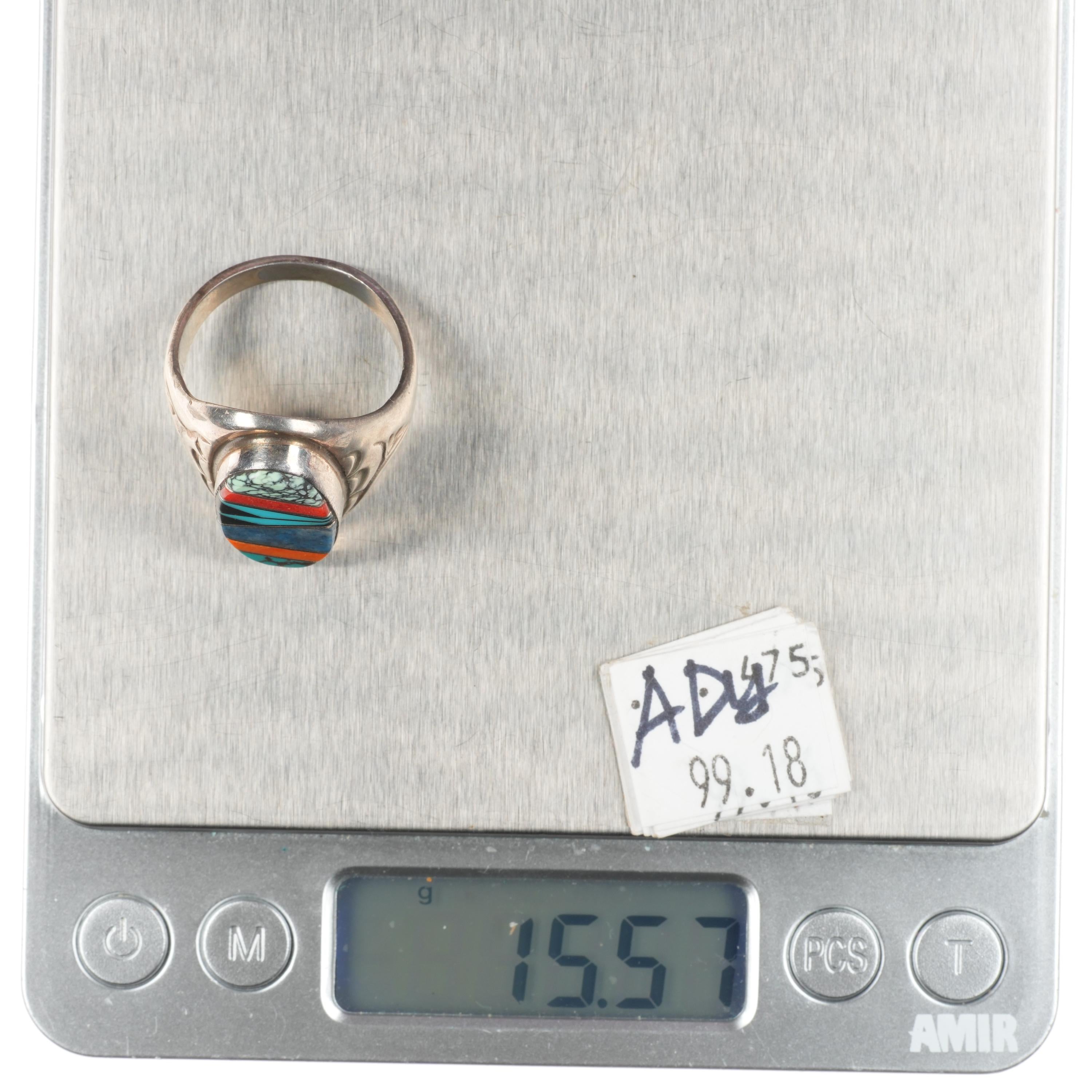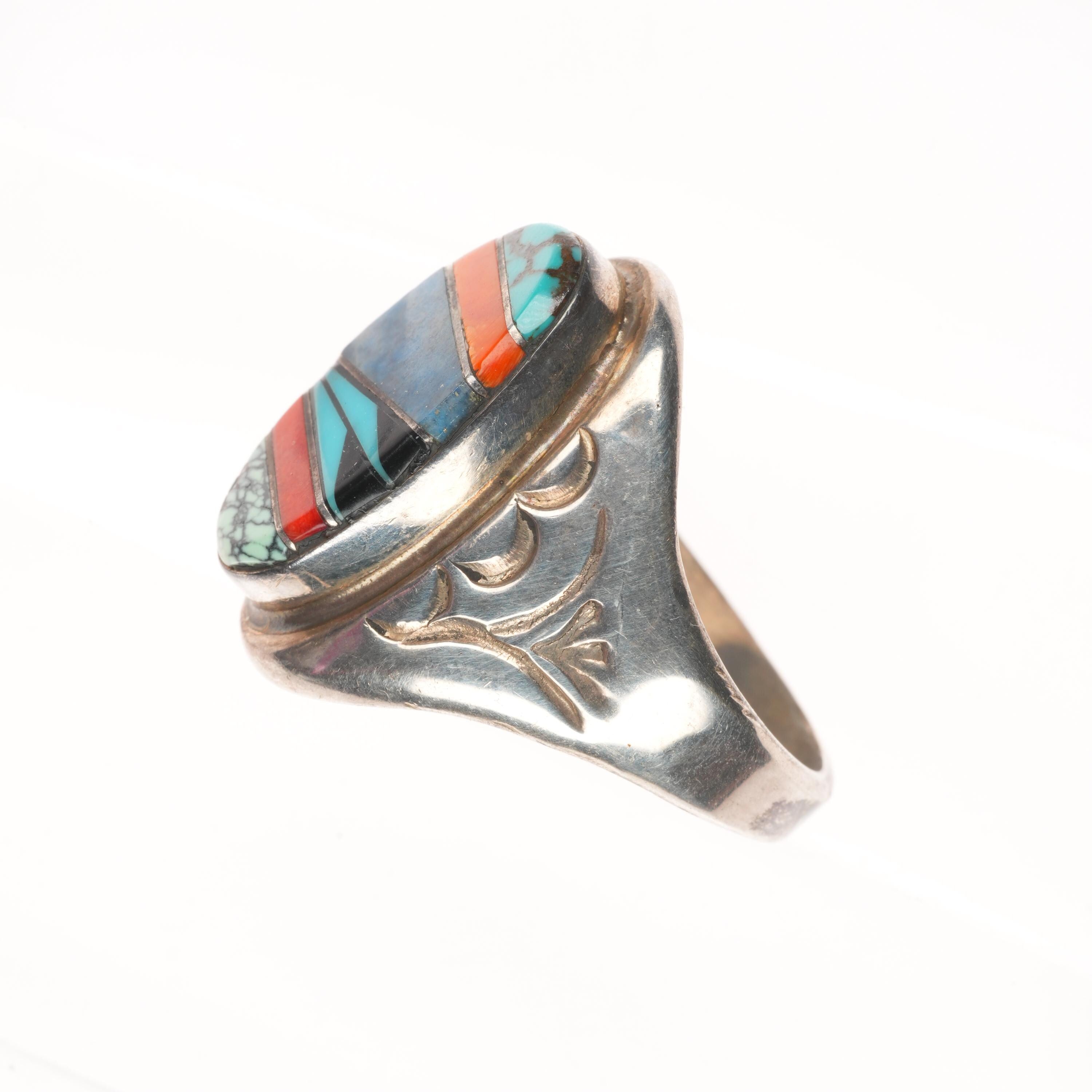 sz12 TL Navajo sterling silver denim lapis, Variscite, turquoise inlay ring. Tested and guaranteed solid sterling silver. Nice ring from the last quarter of the 20th century. No apparent issues. Weight and measurements in pictures.