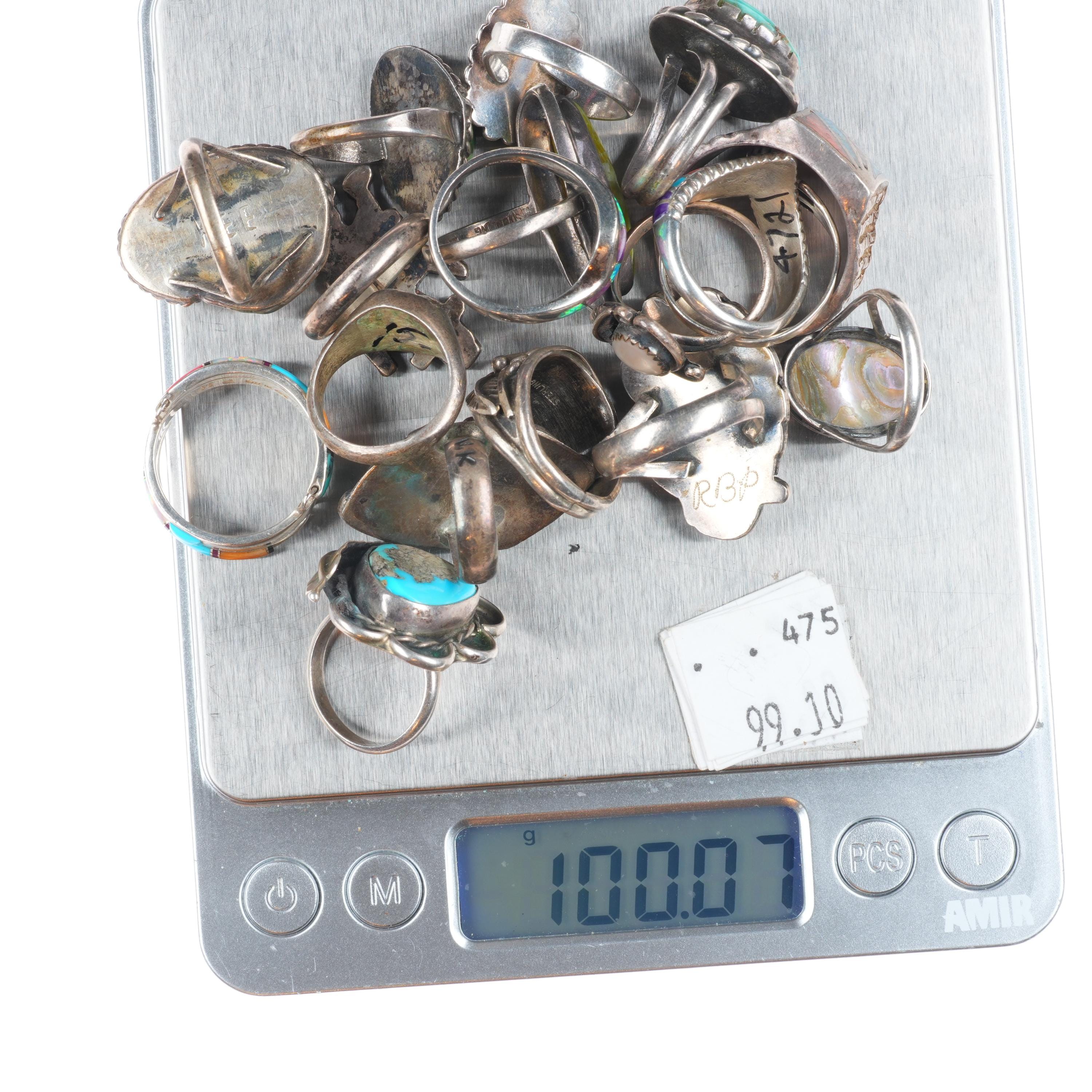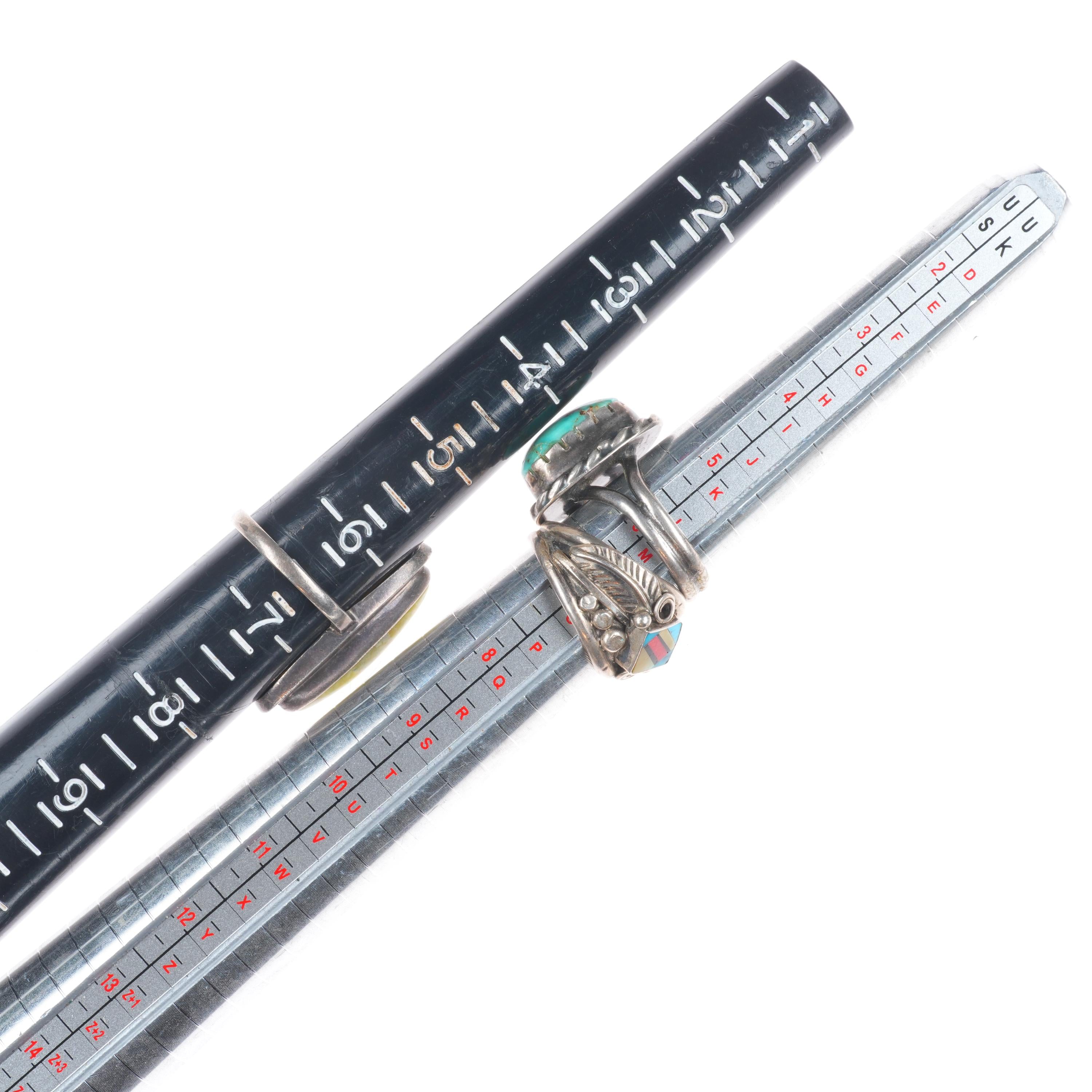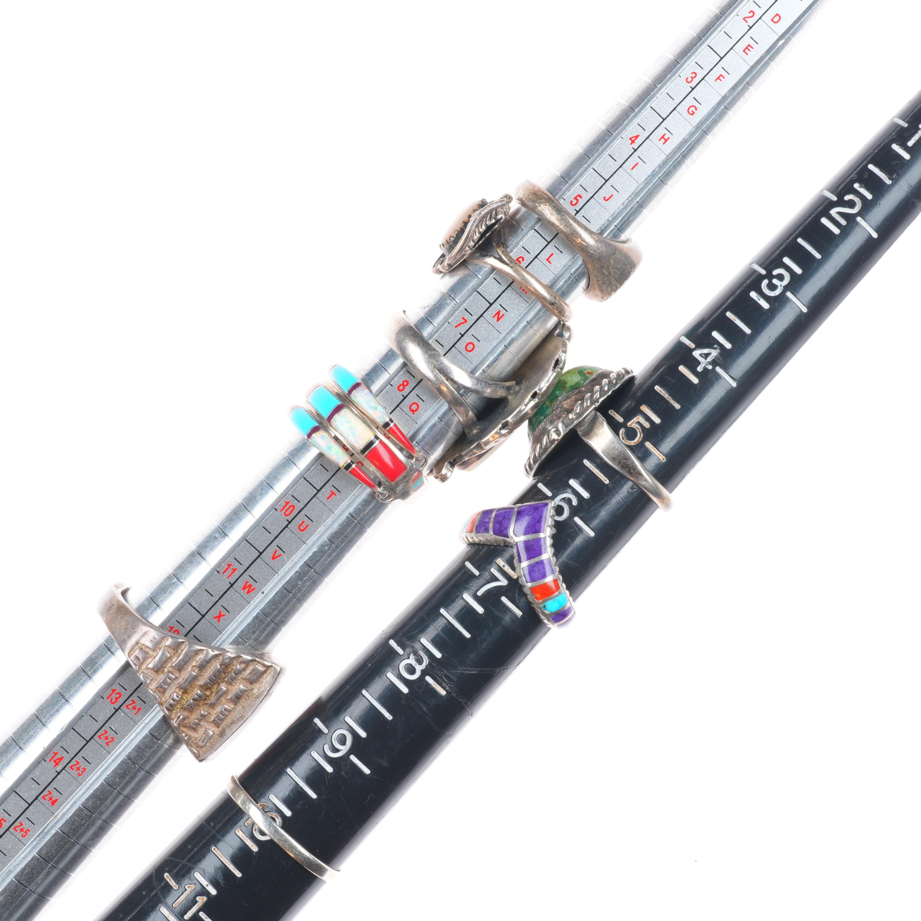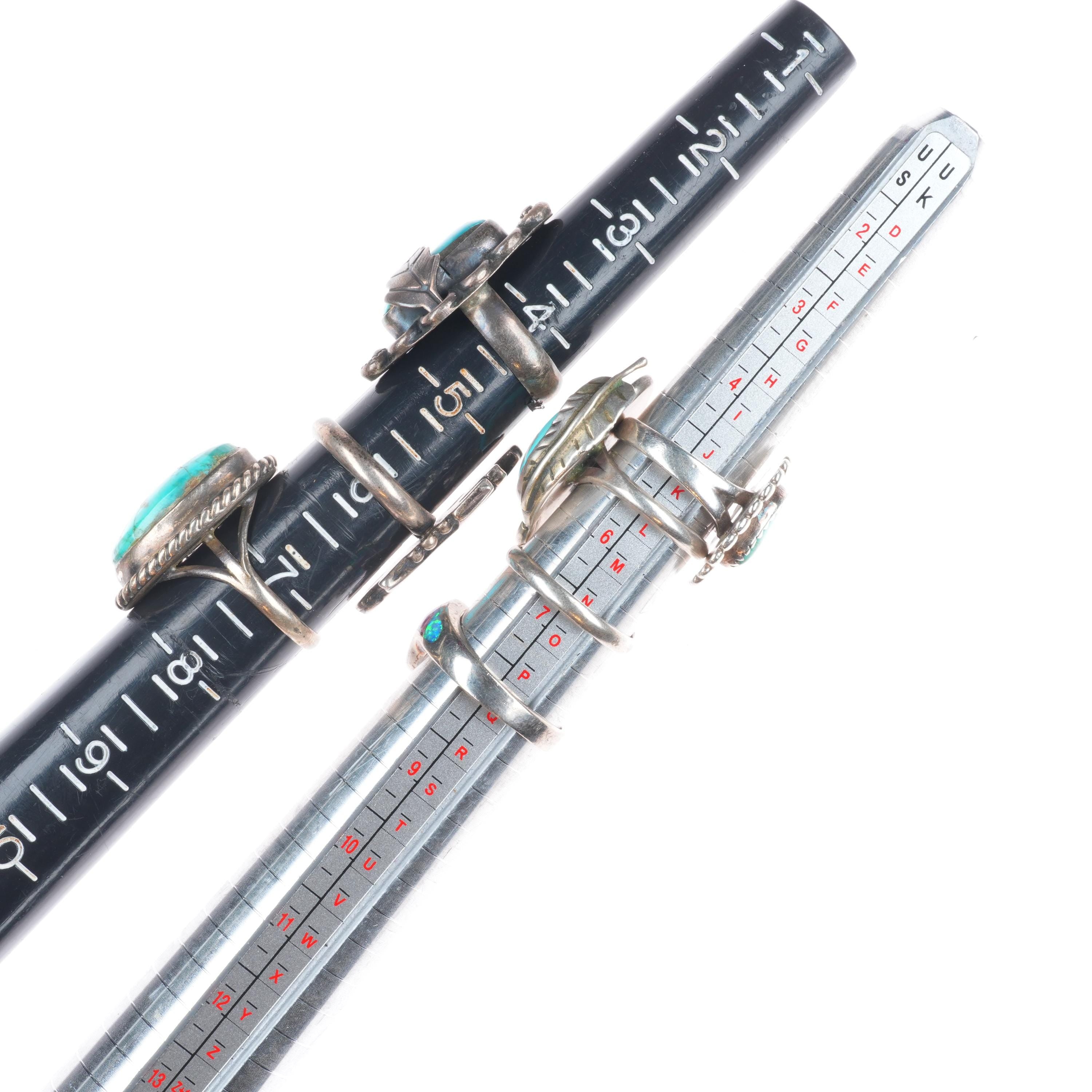 sz4-12 Navajo/Zuni/Southwestern sterling silver turquoise/sugilite rings lot. Tested and guaranteed solid sterling silver. Selling the 18 rings shown with weight and measurements in pictures, shown on sizers. Age appropriate wear. Some marked, some not marked. I am making lots of these lots with my wife photographing and me listing. We are listing in lots due to time limitations, so we are not heavily scrutinizing each ring. Most are going to be Native American made, but there will likely be some southwestern style rings mixed in each lot. Or one two totally unrelated but still sterling. My wife who is making the lots doesn‘t know the difference as she‘s Vietnamese. Please look at the pictures and make up your own mind for condition, etc. There may be dents, cracked stones, etc. I tried to weed out any junk before I gave them to her, but we are in a hurry. Time is the number one consideration when making these lots so there will be some surprises, hopefully more good than bad :)
