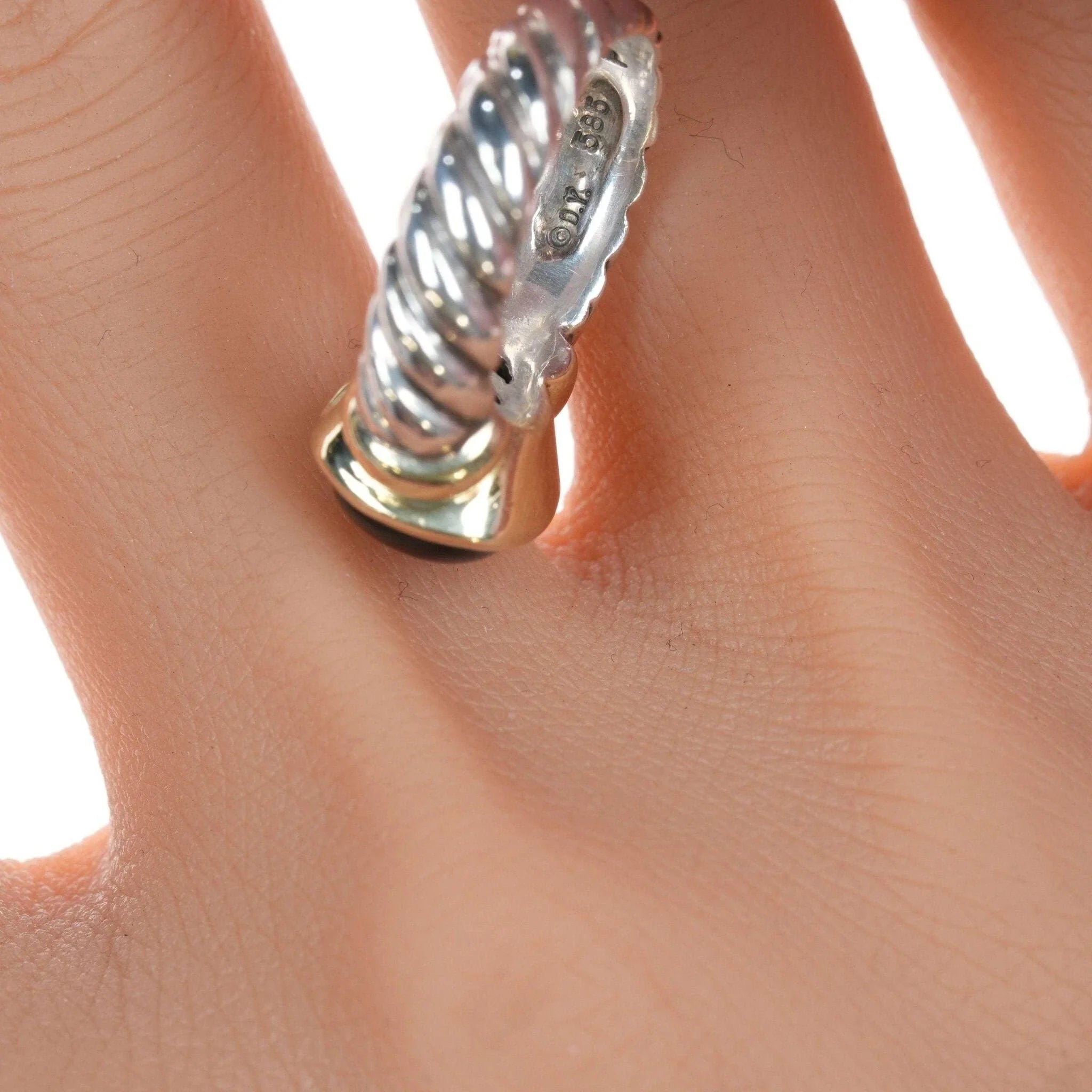sz5 David Yurman 14k/Sterling Onyx ring 10mm x 8mm stone, clean ring with no<br>issues. Guaranteed authentic retired design 6.9 grams. Most rings are shown on a a ring sizer in the pictures and the size is typically given at the beginning of the title and description. Women's Size 5 Ring.