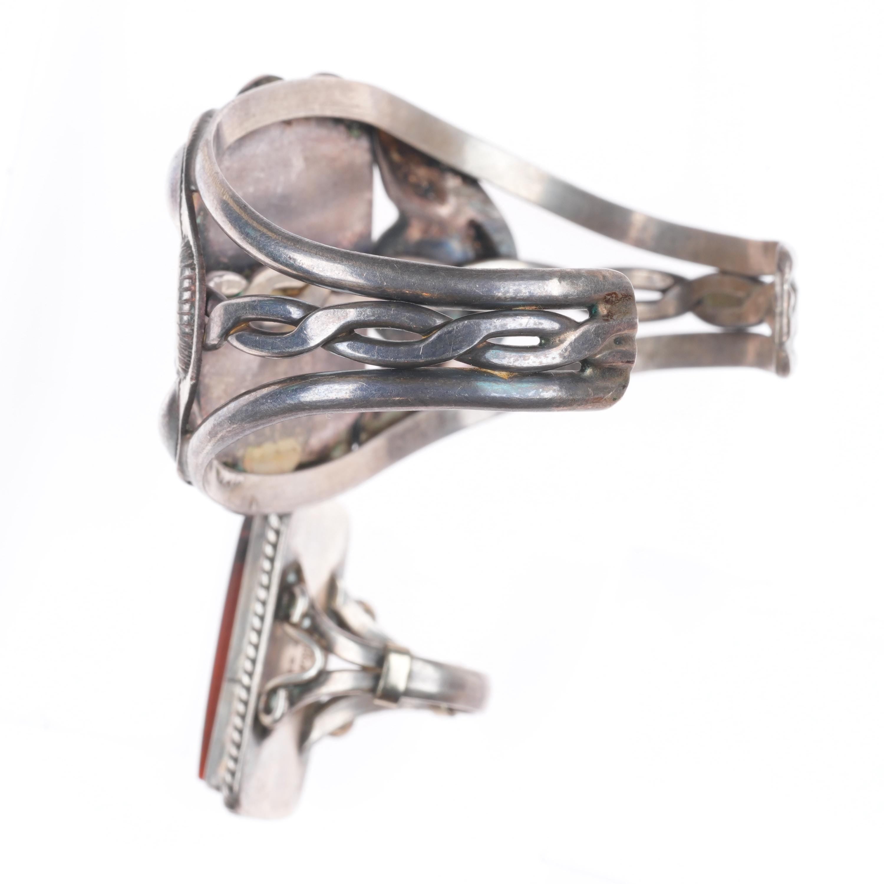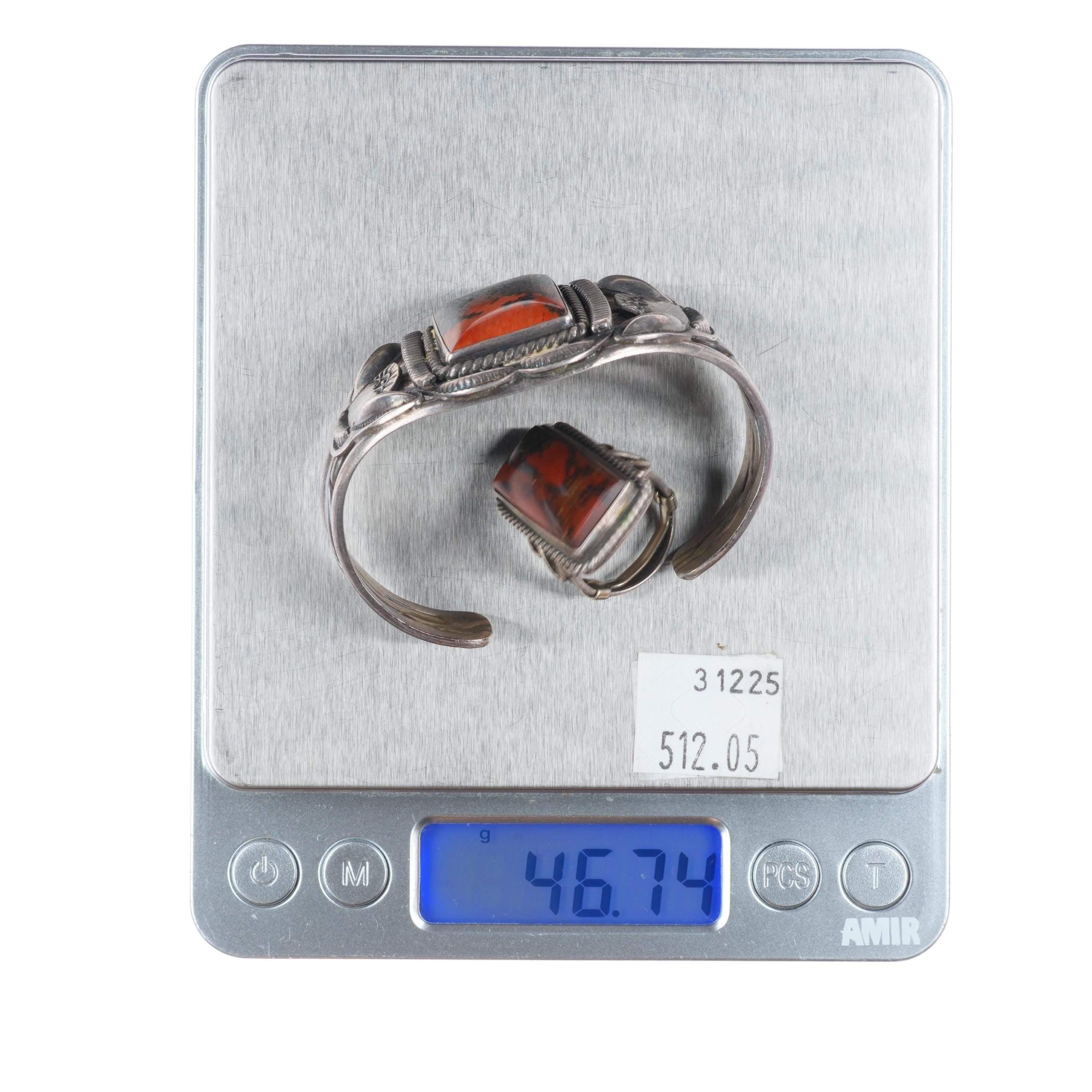 sz5 ring 6" cuff bracelet 1940 Garden of the Gods/Navajo petrified wood sterling. Tested and guaranteed solid sterling silver with weight and measurements in pictures. Circa second quarter of the 20th century with some expected overall wear but no damage.. This ring has a bar inside to make it smaller, if removed it would likely be more like a size 6. Ring was made at the Garden of the Gods. I did not intend for these to be listed together but will give it a try since the fantastic pics were taken already. Cuff bracelet unmarked. In my opinion each of these pieces are of about equal value so I would possibly be willing to split them up.