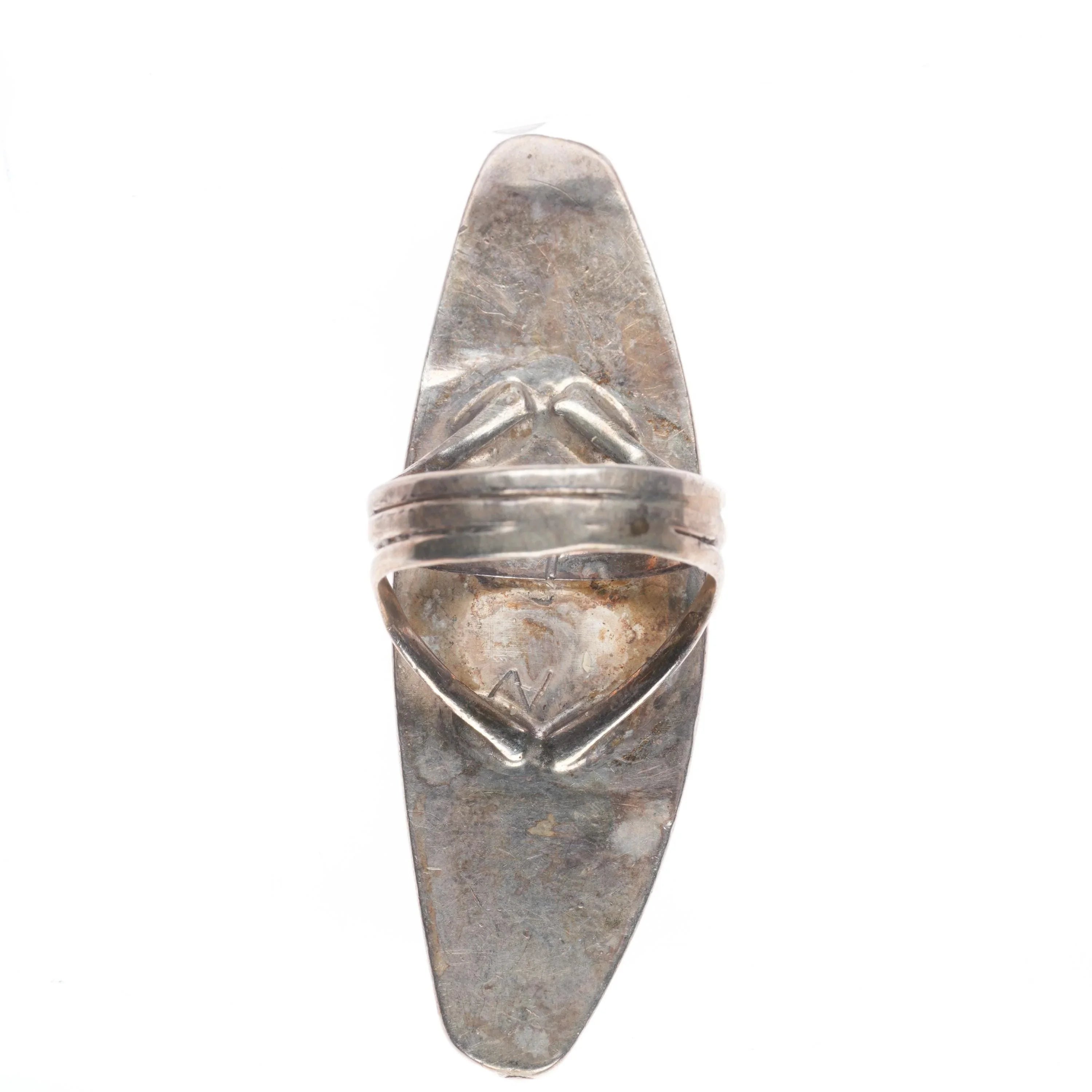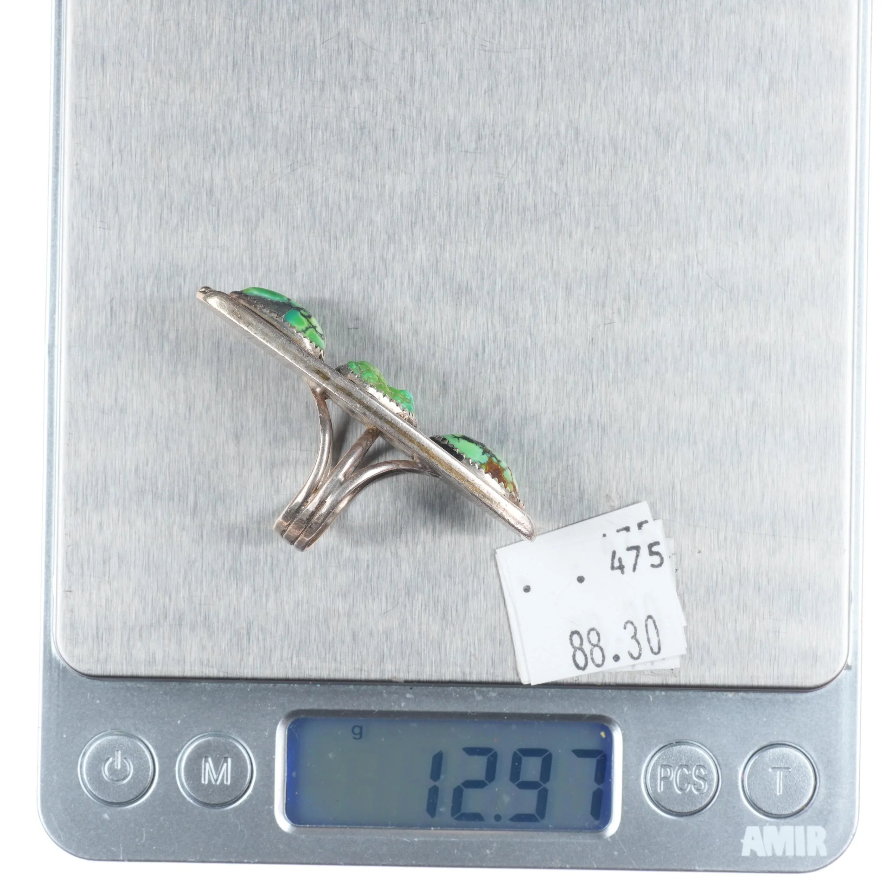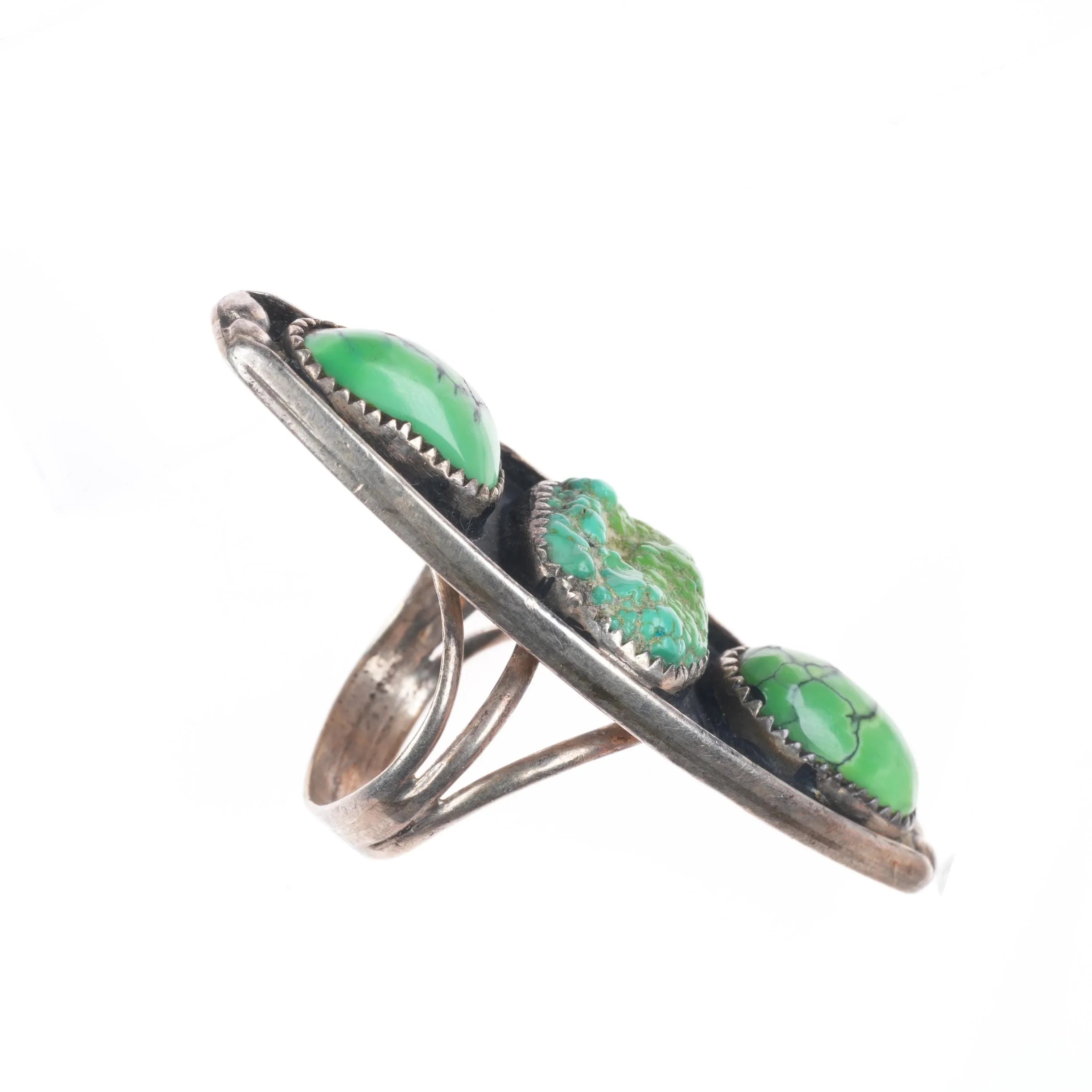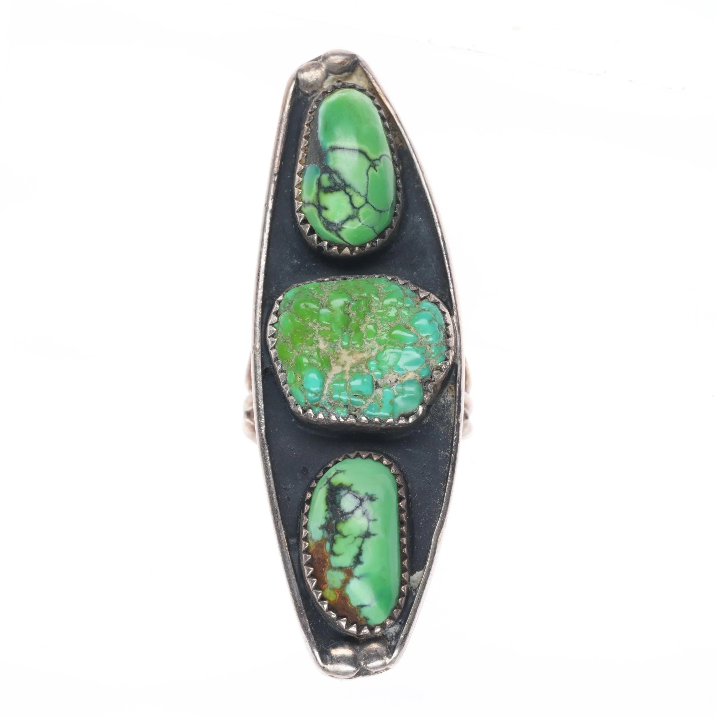 sz6 long Vintage Lime green turquoise/variscite Navajo sterling ring Tested and guaranteed solid sterling silver with weight and measurements in pictures. Nice ring from the third quarter of the 20th century. Great condition, unmarked. Great stones, unsure of mines. Center stone could easily be some rough Carico Lake.