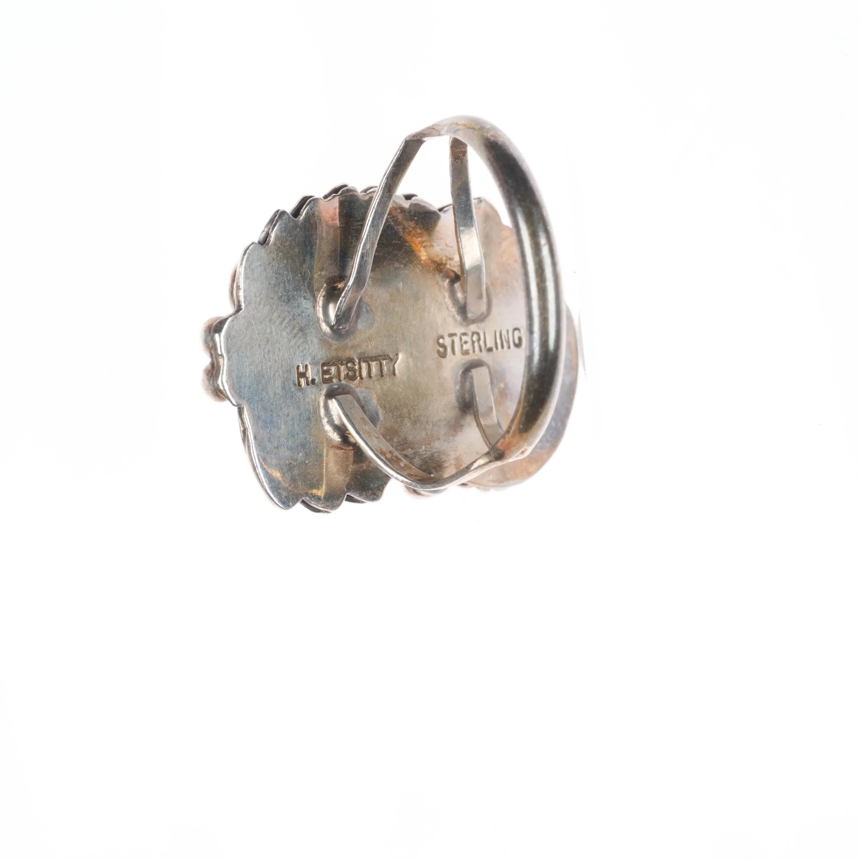 sz9 M Etsitty Navajo sterling silver white buffalo feather design ring. Tested and guaranteed solid sterling silver with weight and measurements in pictures. Nice ring from the last quarter of the 20th century.