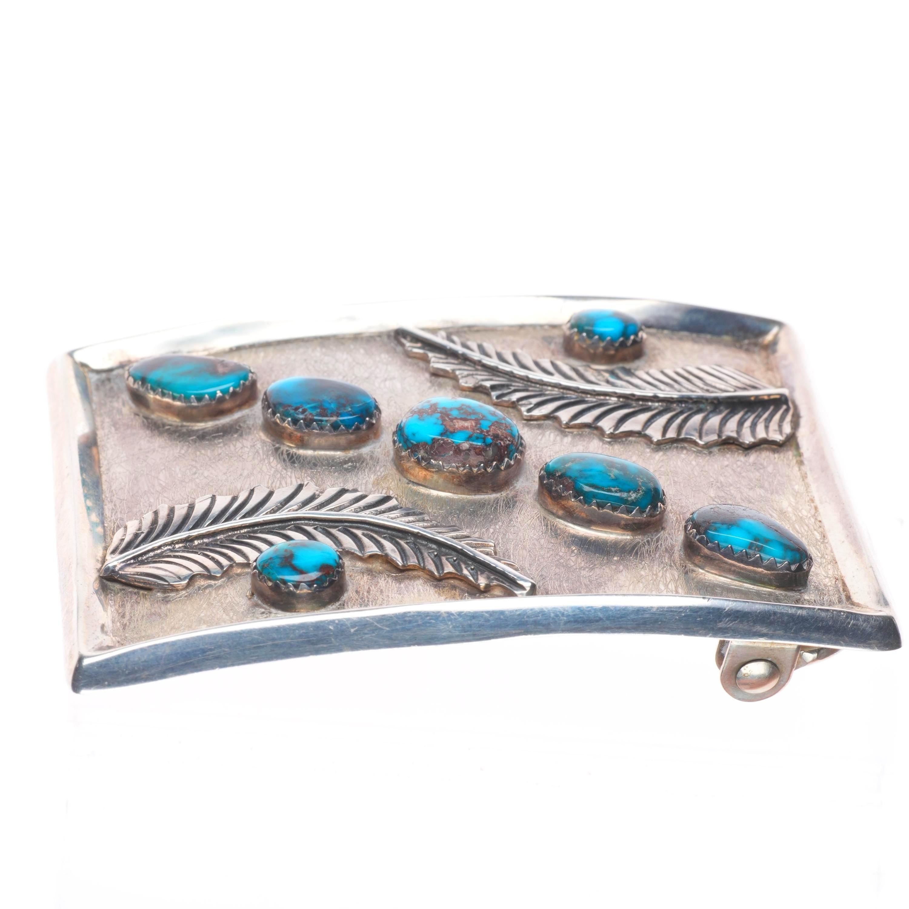 Vintage Bisbee turquoise Navajo feather design sterling silver belt buckle. Tested and guaranteed solid sterling silver with weight and measurements in pictures. Fully functional. All items will likely have some age appropriate/expected wear, the older they are the more wear they should have. Circa third quarter of the 20th century.. 61 grams, fits up to a 1.75" belt.