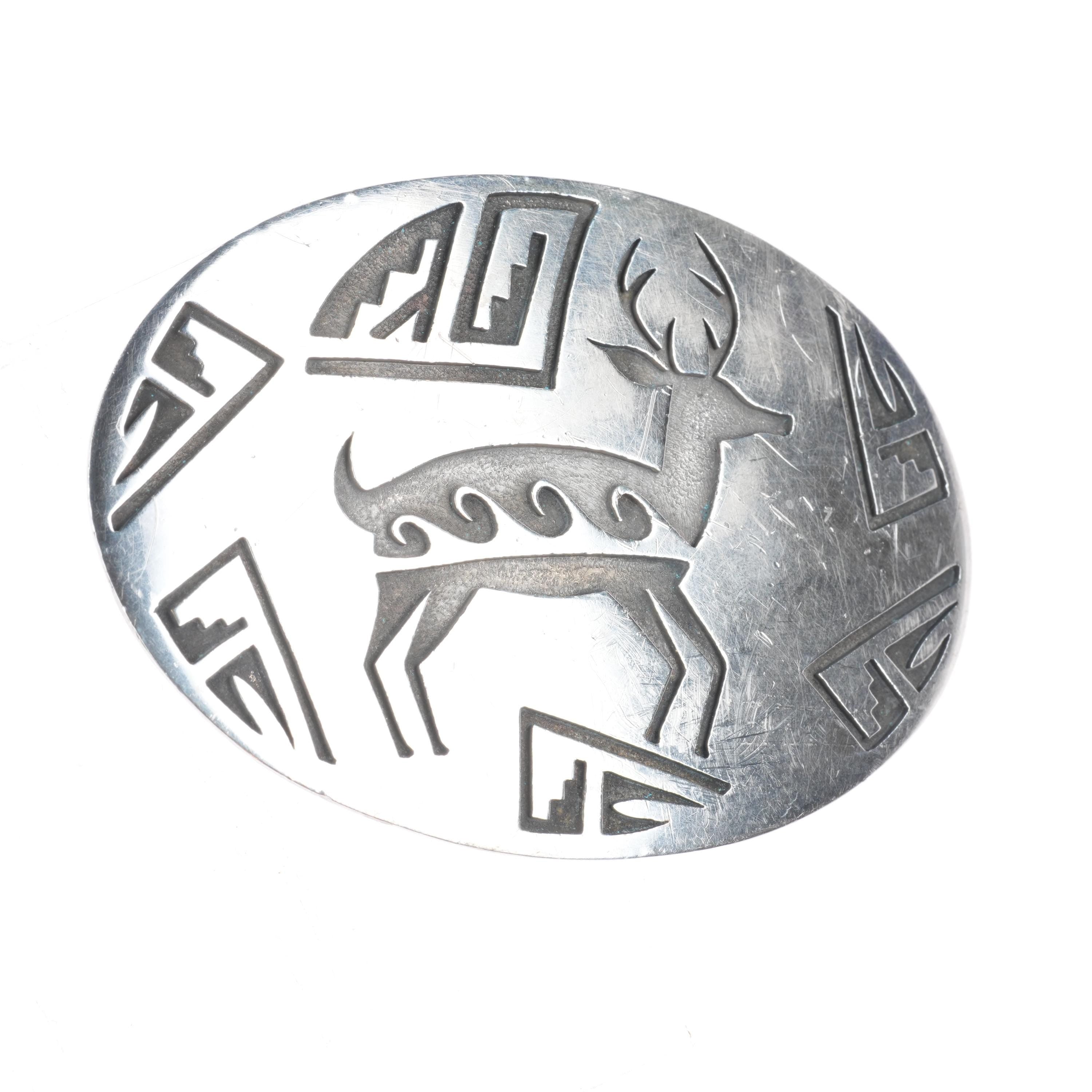Vintage Navajo overlay sterling silver belt buckle with deer overlay
