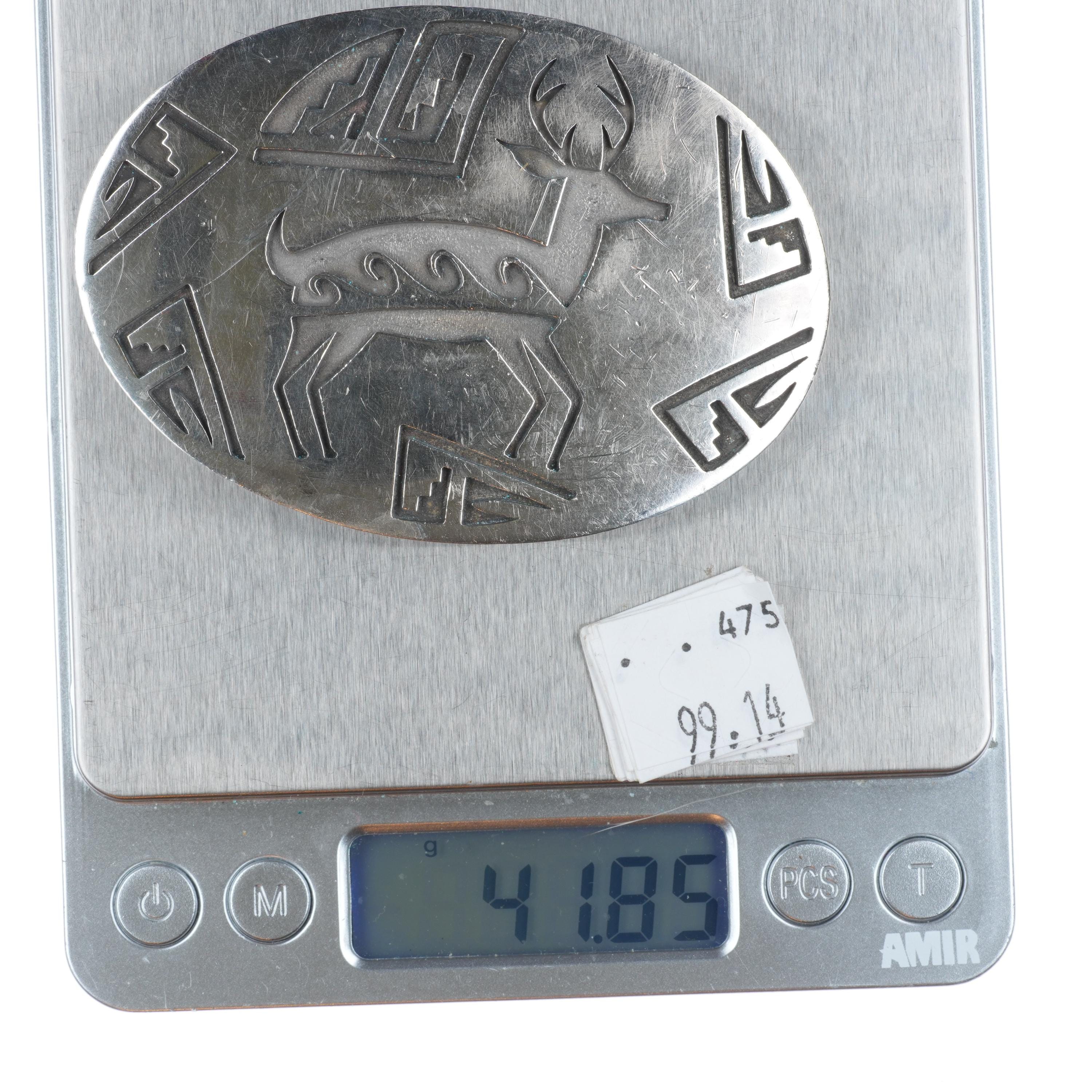 Vintage Navajo overlay sterling silver belt buckle with deer overlay, fits up to a 1.5" wide belt. Tested and guaranteed solid sterling silver. Weight and measurements in pictures, circa last quarter of the 20th century. Unknown hallmark.