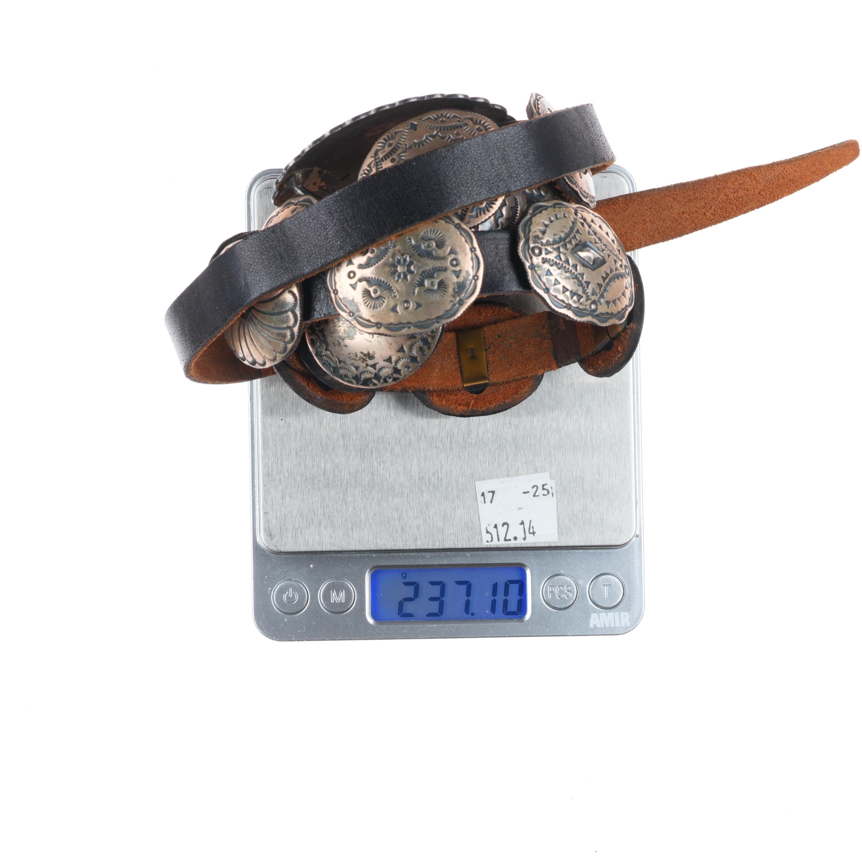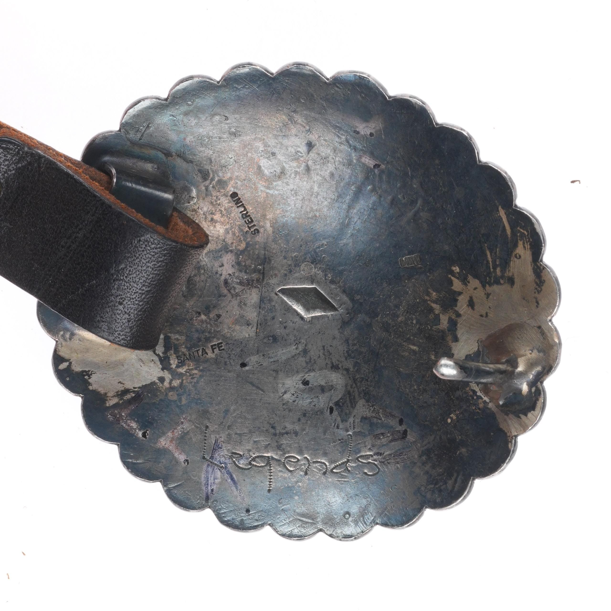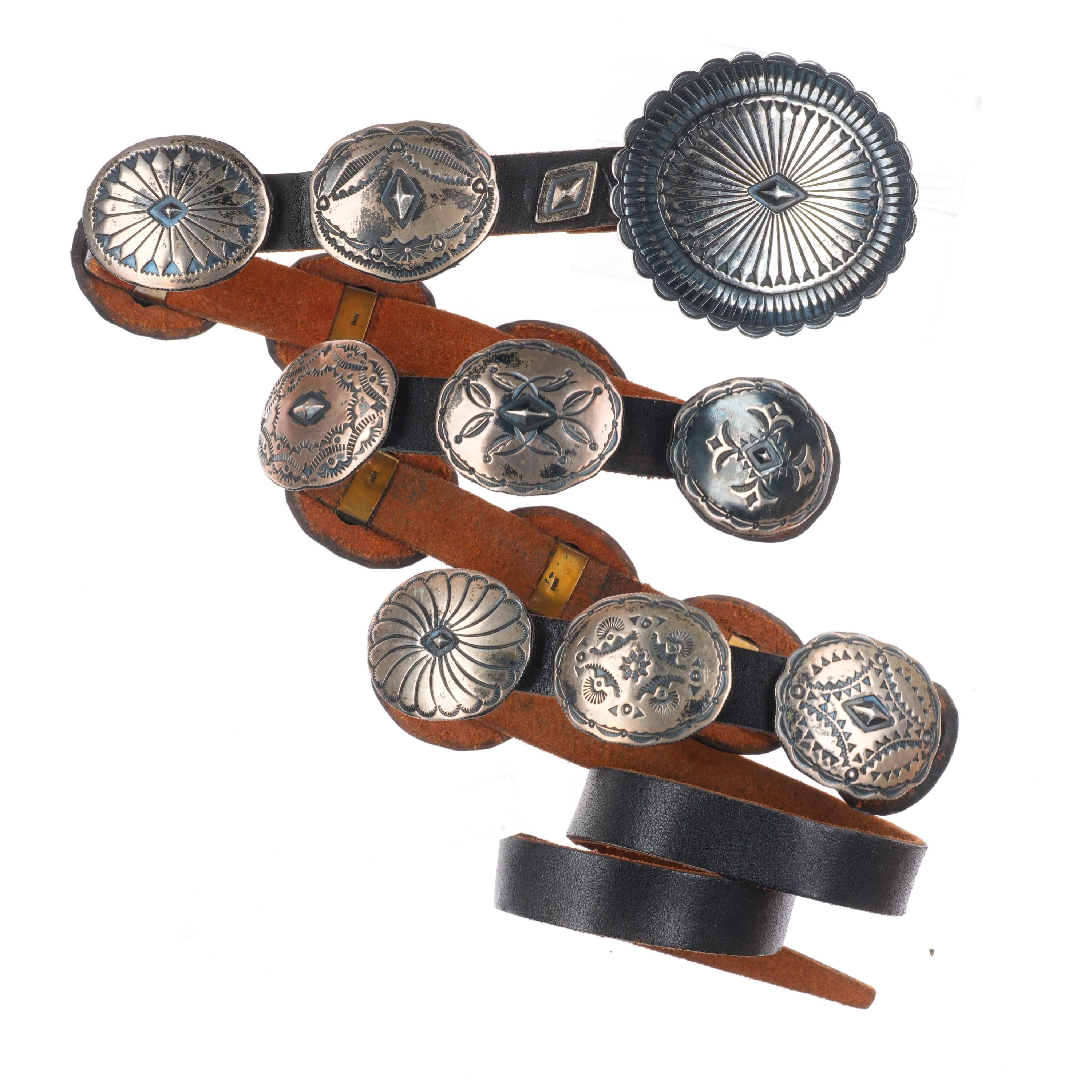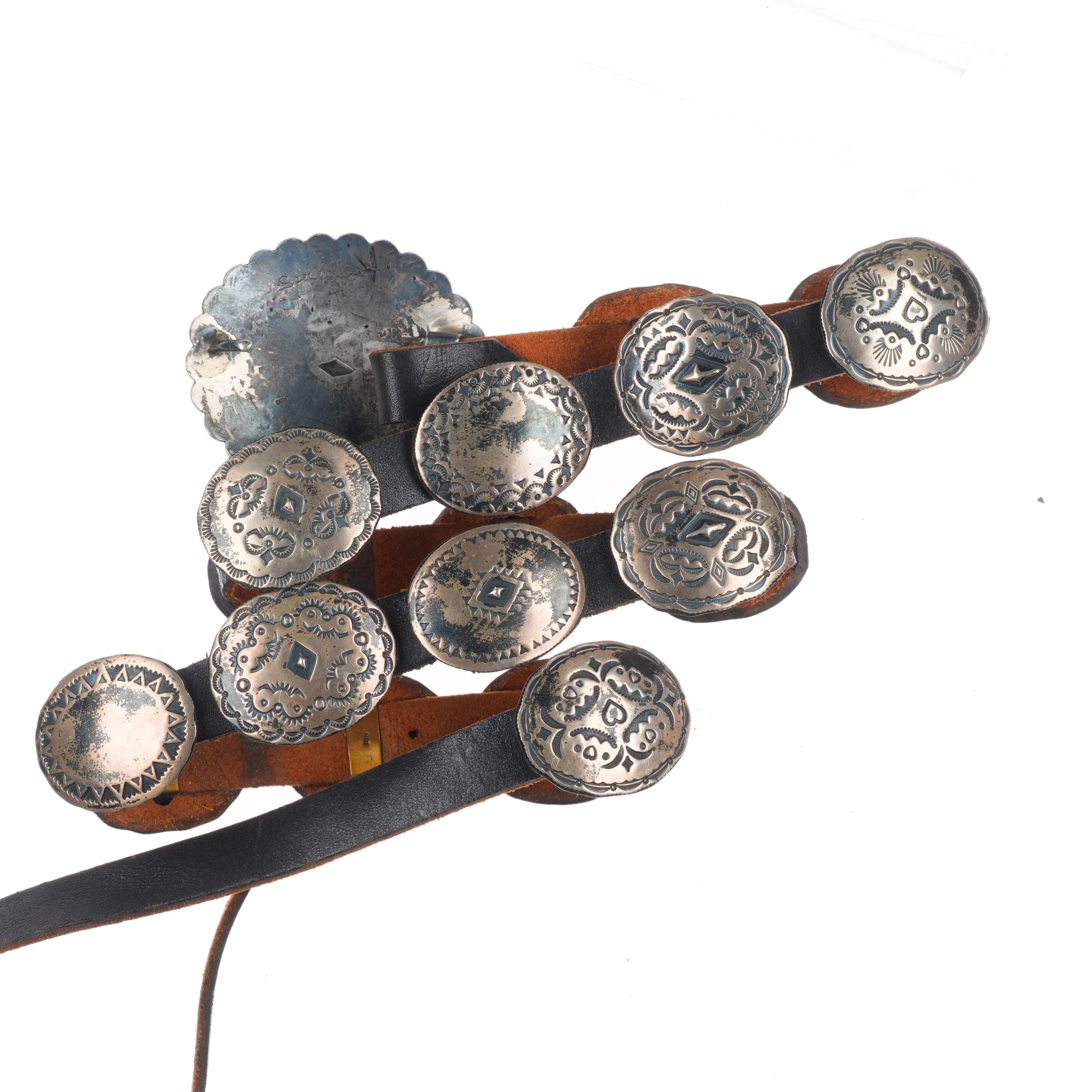 Vintage Navajo/Southwestern sterling silver hand stamped concho belt. Tested and guaranteed solid sterling silver with weight and measurements in pictures. Fully functional, Legends Santa Fe retailer mark on the back, illegible/unknown stamped hallmark also shown in pics. Likely Navajo made. Fits up to a 51" waist but can be hooked shorter, great condition, circa last quarter of the 20th century. I do not believe there are any holes towards the end but I can put holes where you like upon request. 17 conchos and 1 buckle