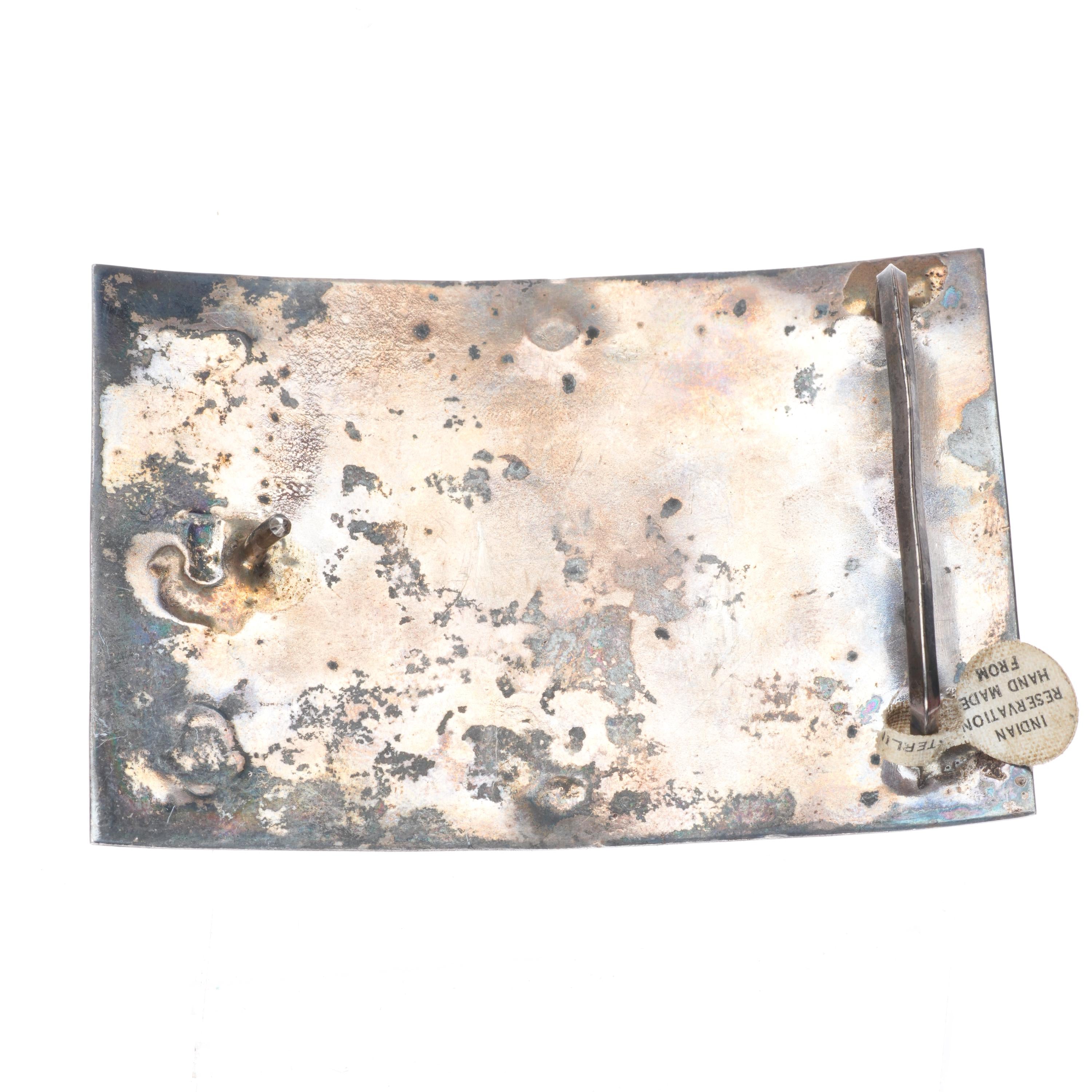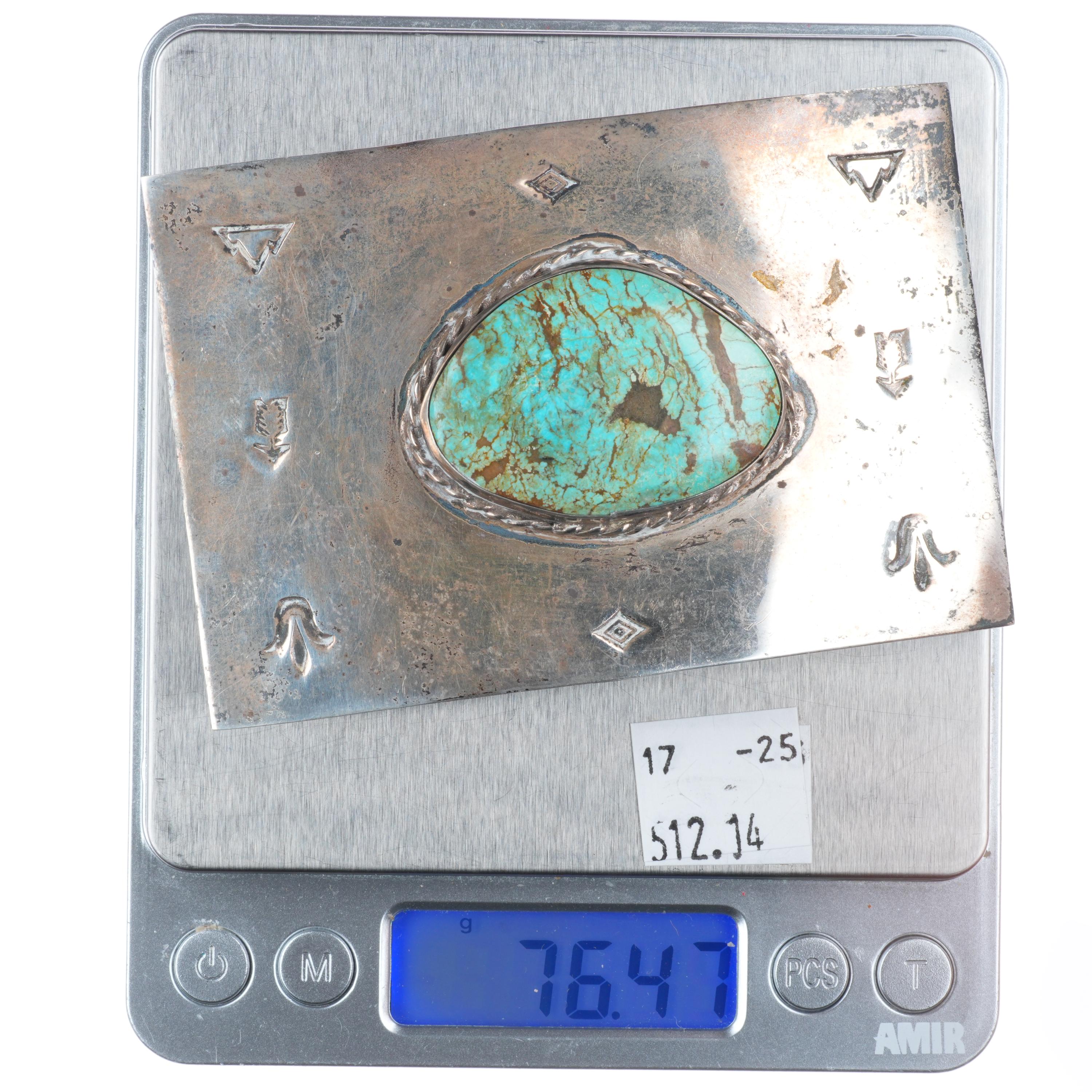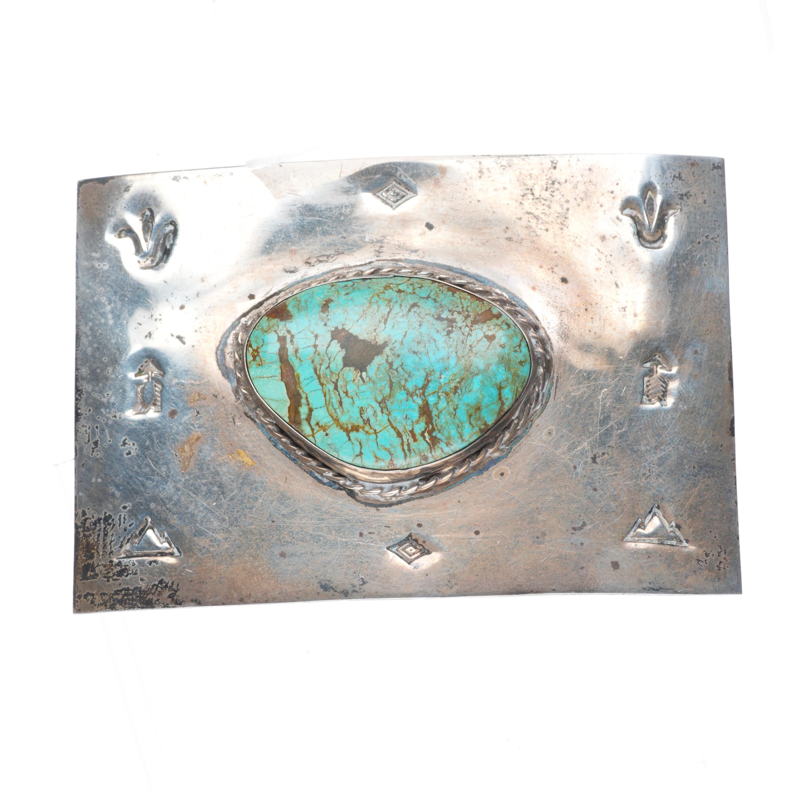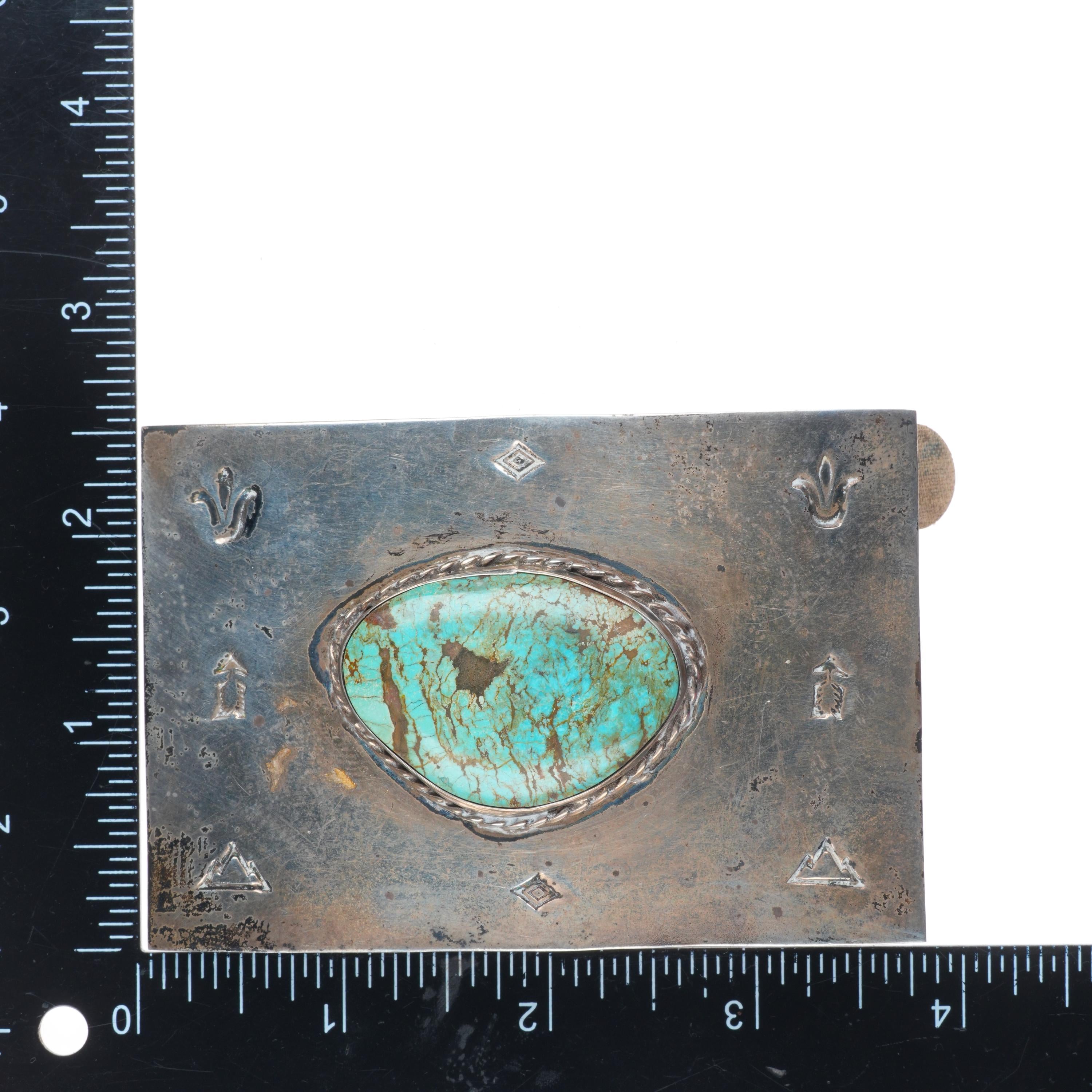 Vintage Navajo sterling silver belt buckle with center turquoise stone. Tested and guaranteed solid sterling silver with weight and measurements in pictures. Fully functional. All items will likely have some age appropriate/expected wear, the older they are the more wear they should have. Circa third quarter of the 20th century.. Fits a 2" belt.