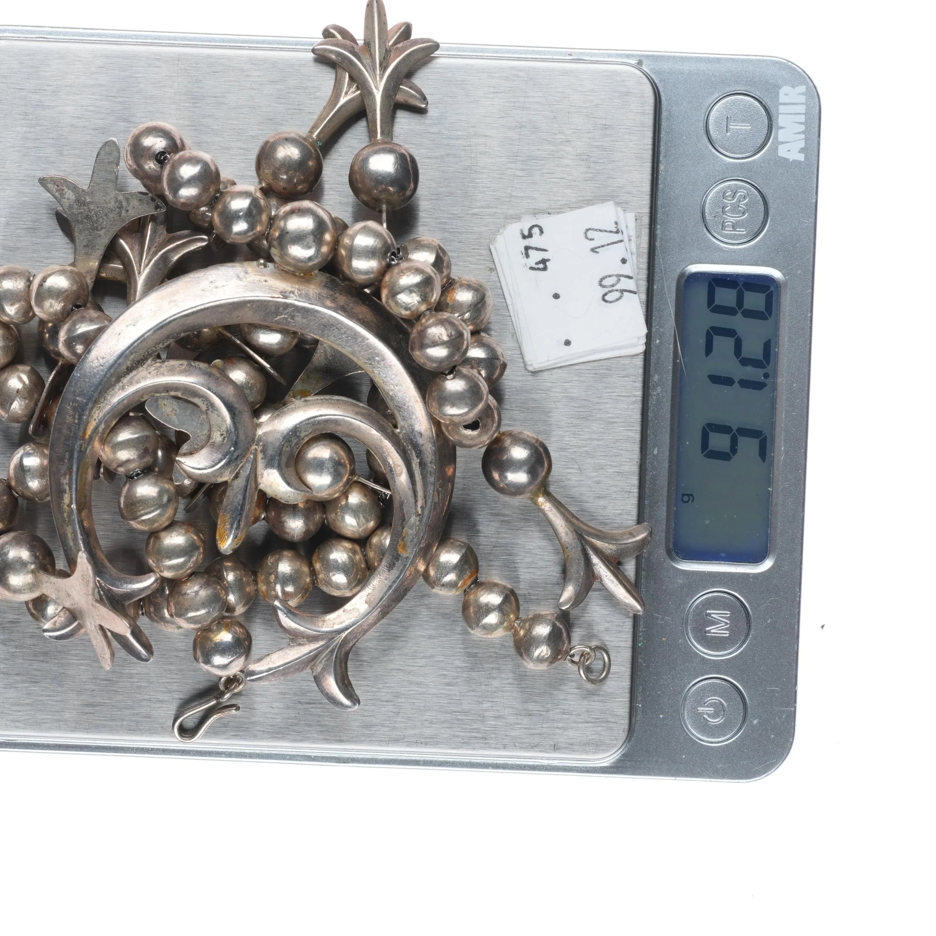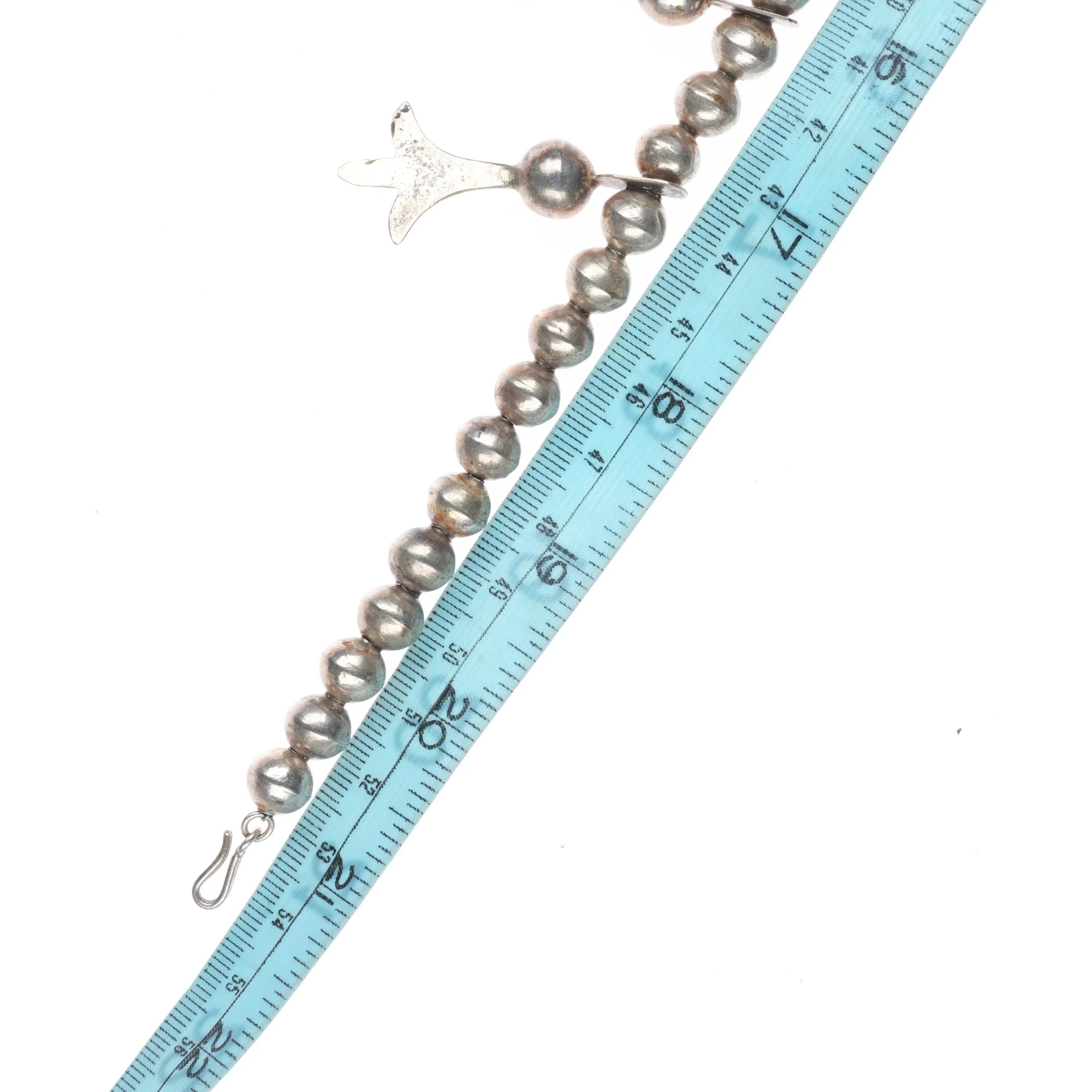 Vintage Navajo sterling silver squash blossom necklace w/cast naja and blossoms. Circa third quarter of the 20th century, tested and guaranteed solid sterling silver. No apparent issues or markings. 21.5" long.