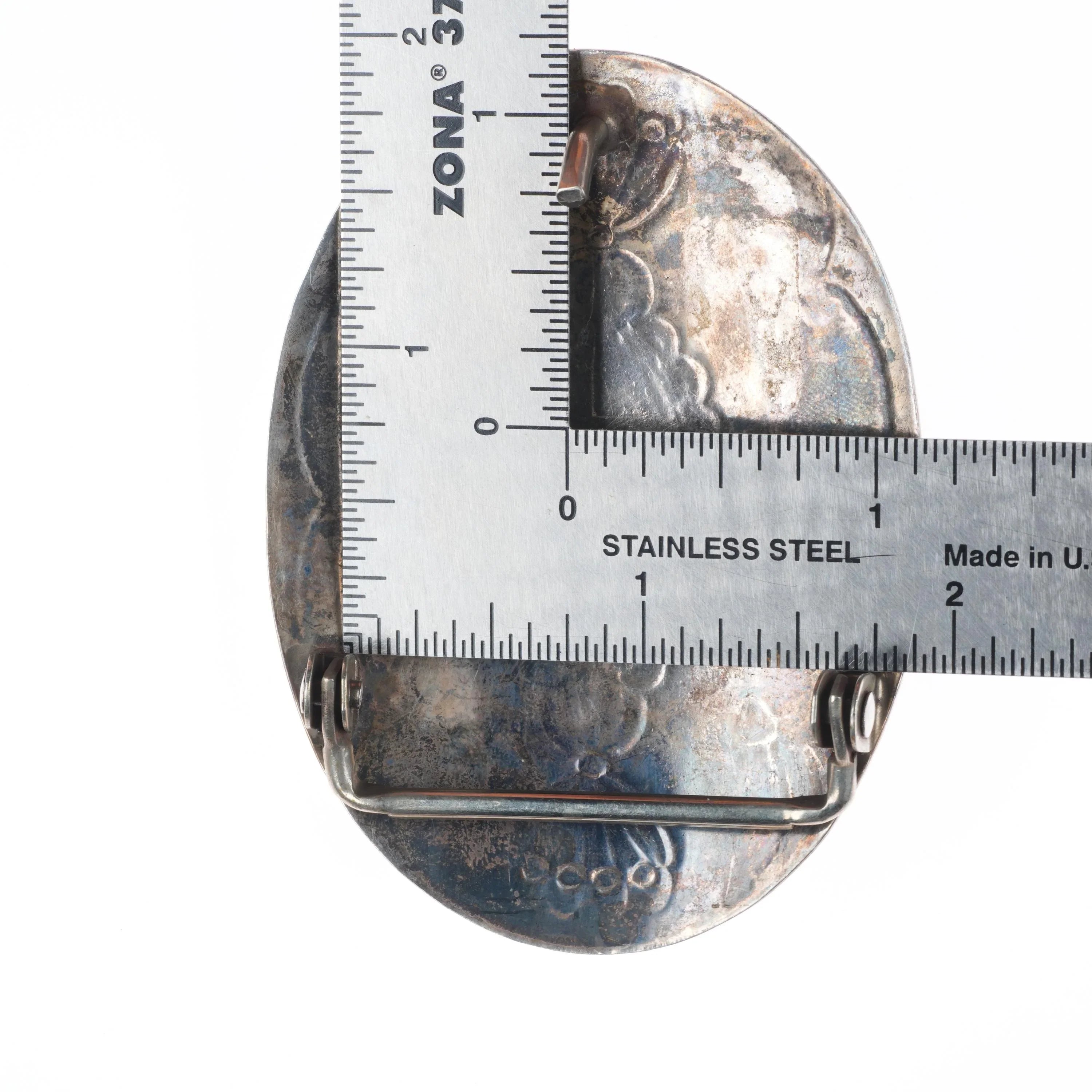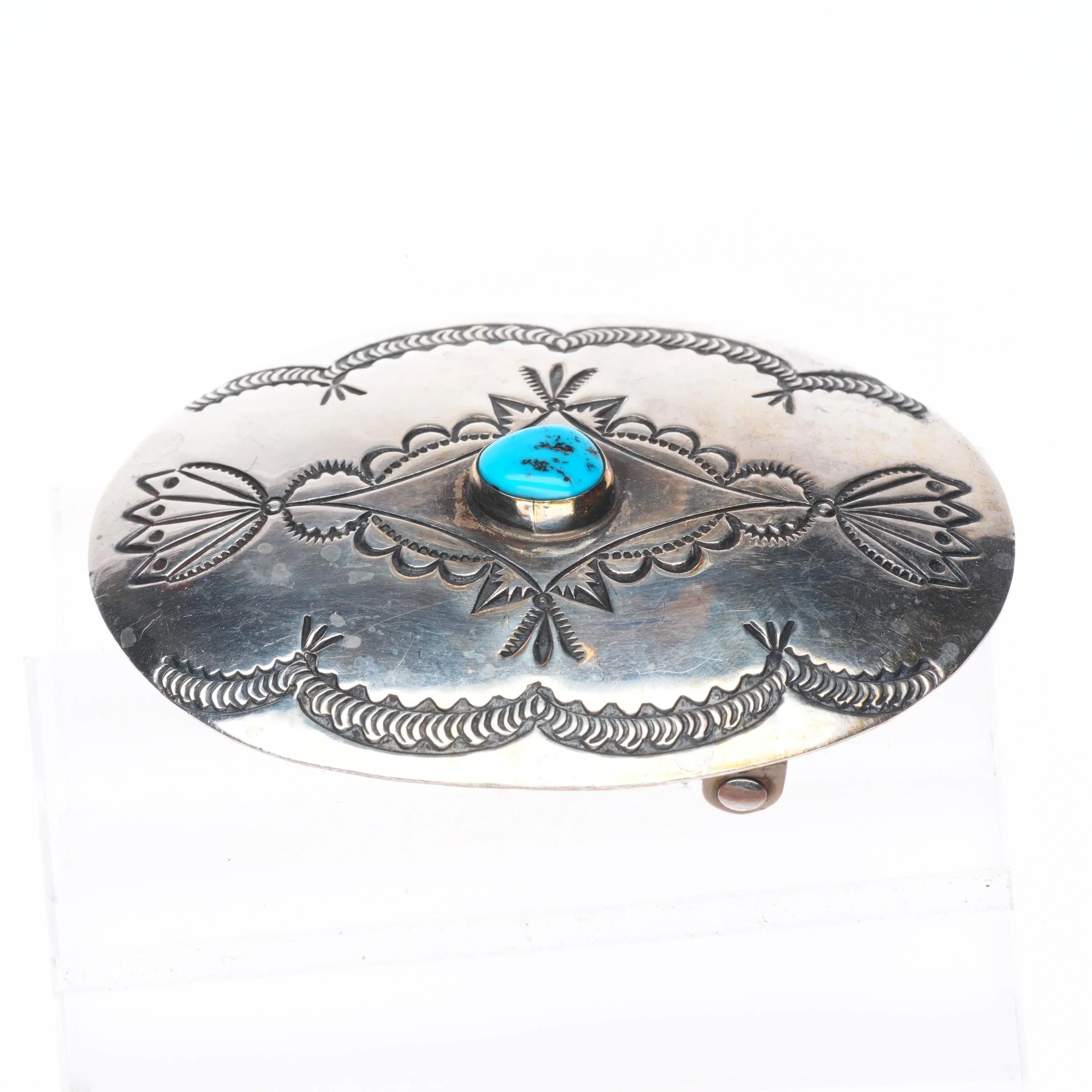 Vintage Navajo sterling silver turquoise belt buckle w/nice stampings. Tested and guaranteed solid sterling silver, fits up to a 1.5" wide belt. Weight and measurements in pictures, circa fourth quarter of the 20th century.