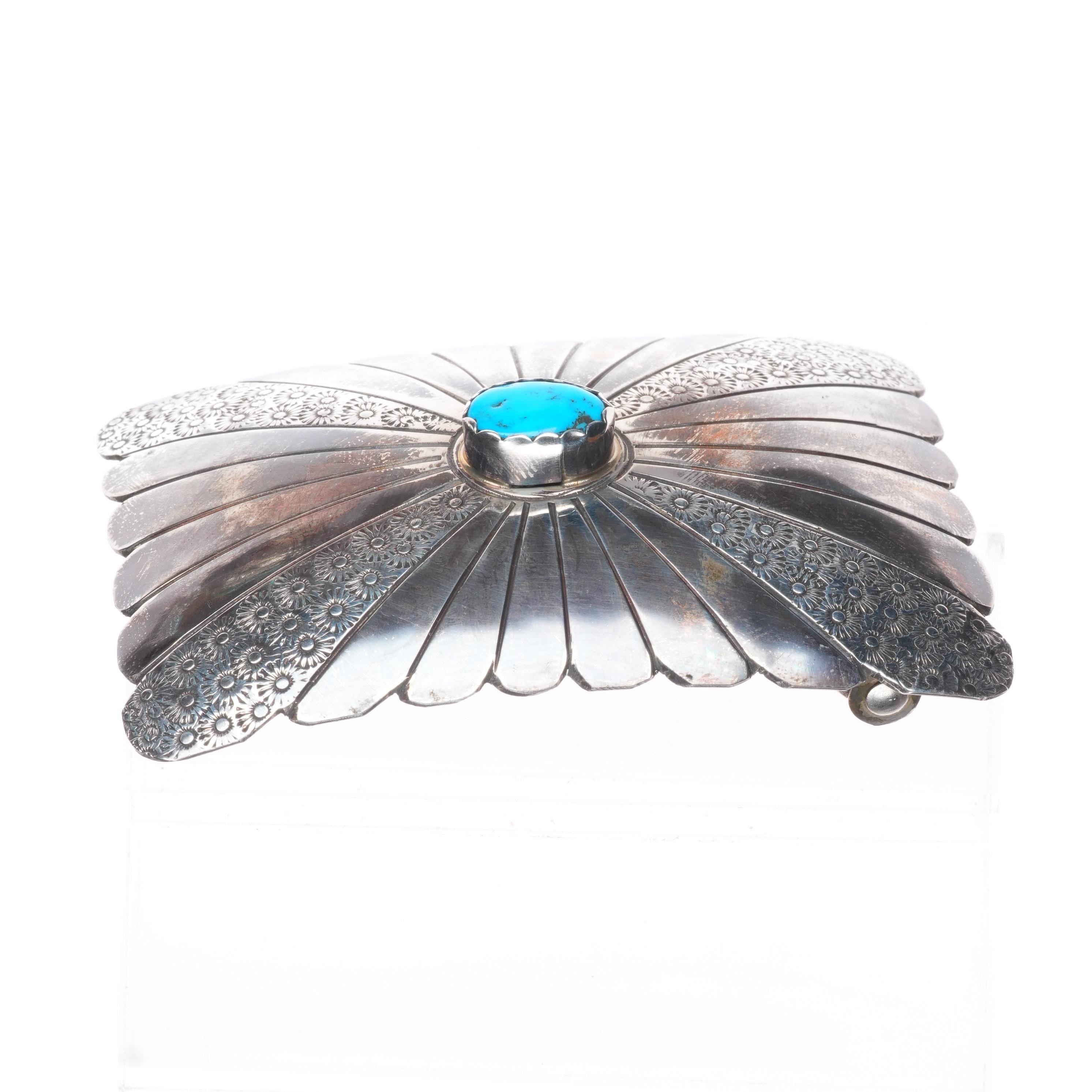 Vintage Navajo sterling silver turquoise belt buckle with rayed design