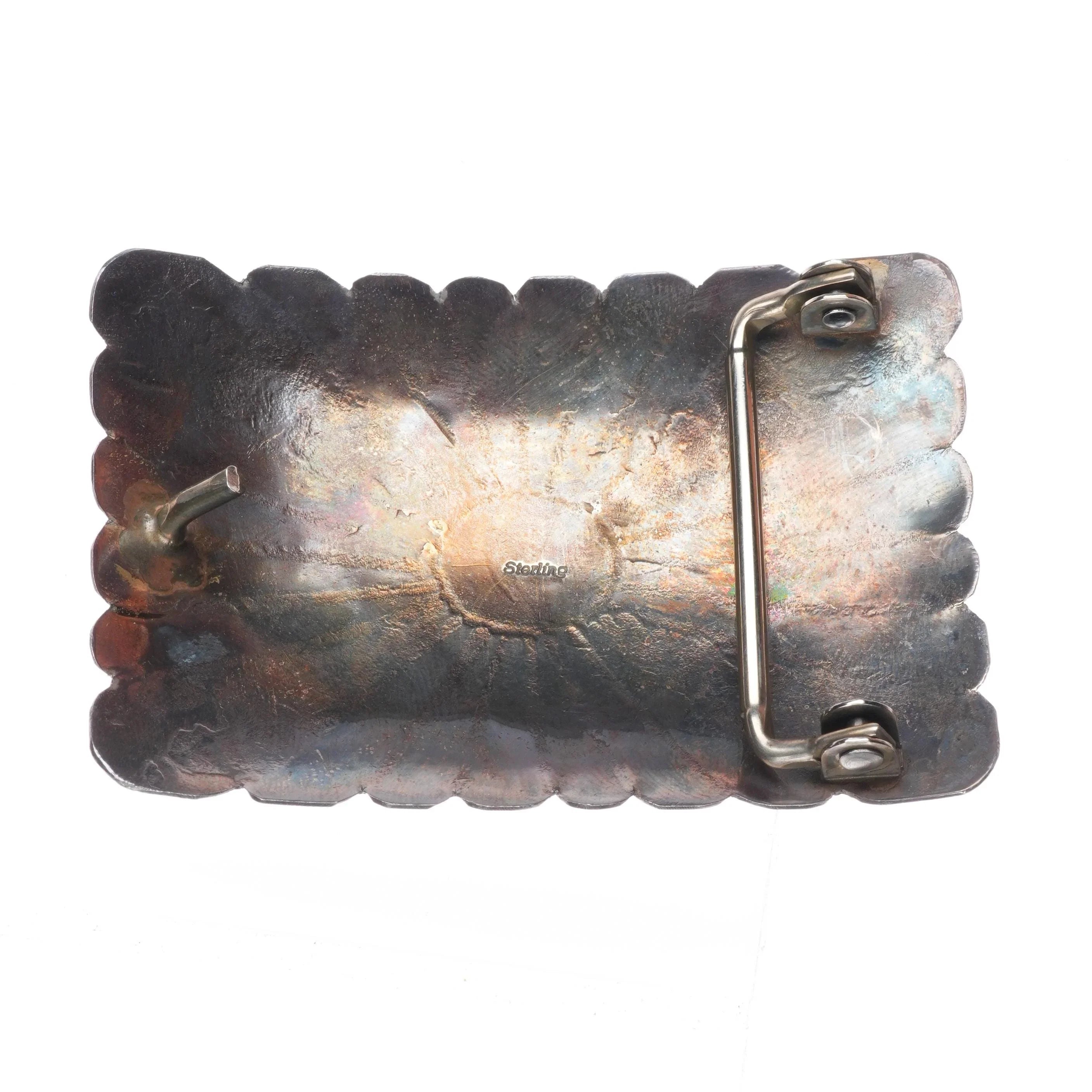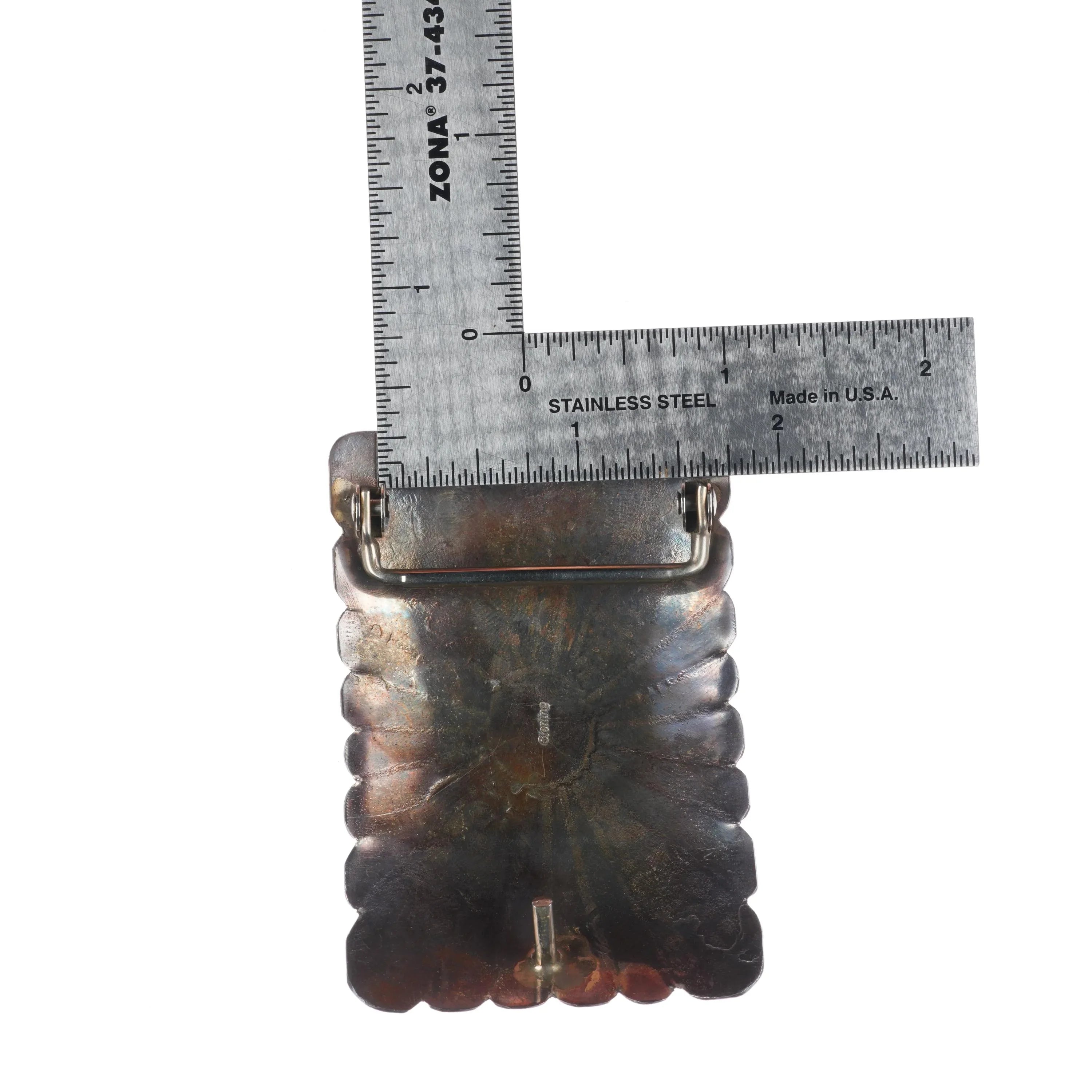 Vintage Navajo sterling silver turquoise belt buckle with rayed design. Tested and guaranteed solid sterling silver, fits up to a 1.5" wide belt. Weight and measurements in pictures, circa last quarter of the 20th century.
