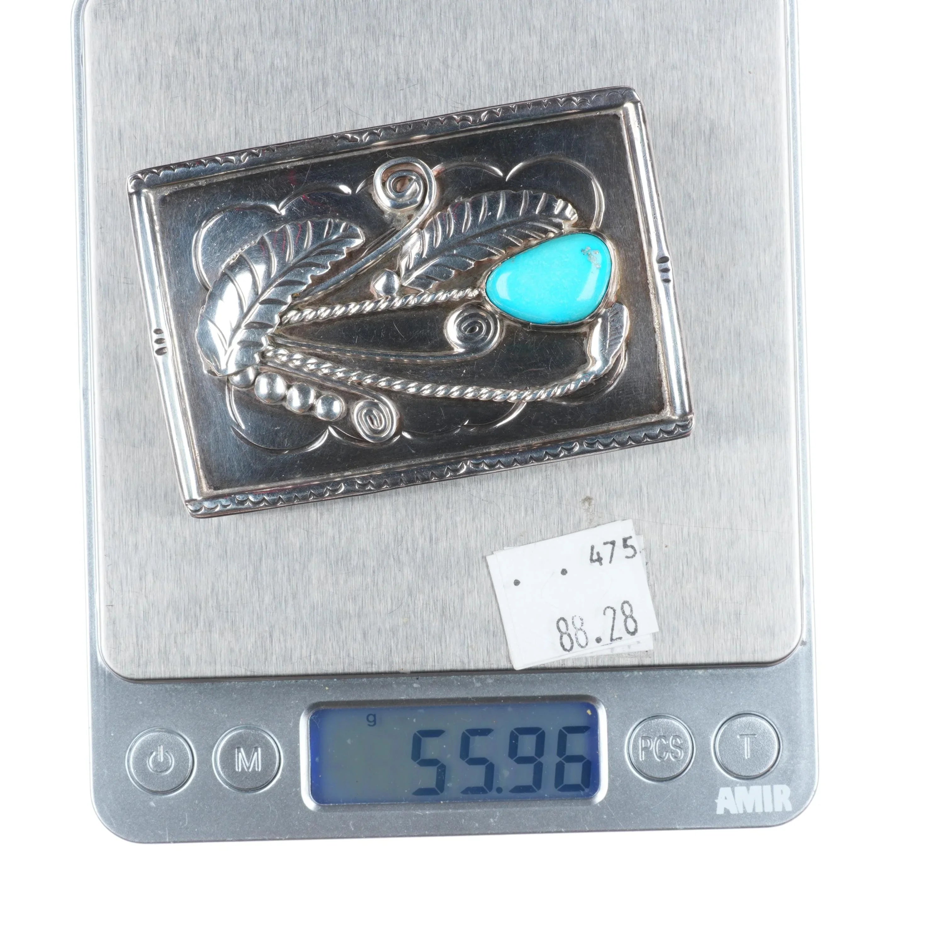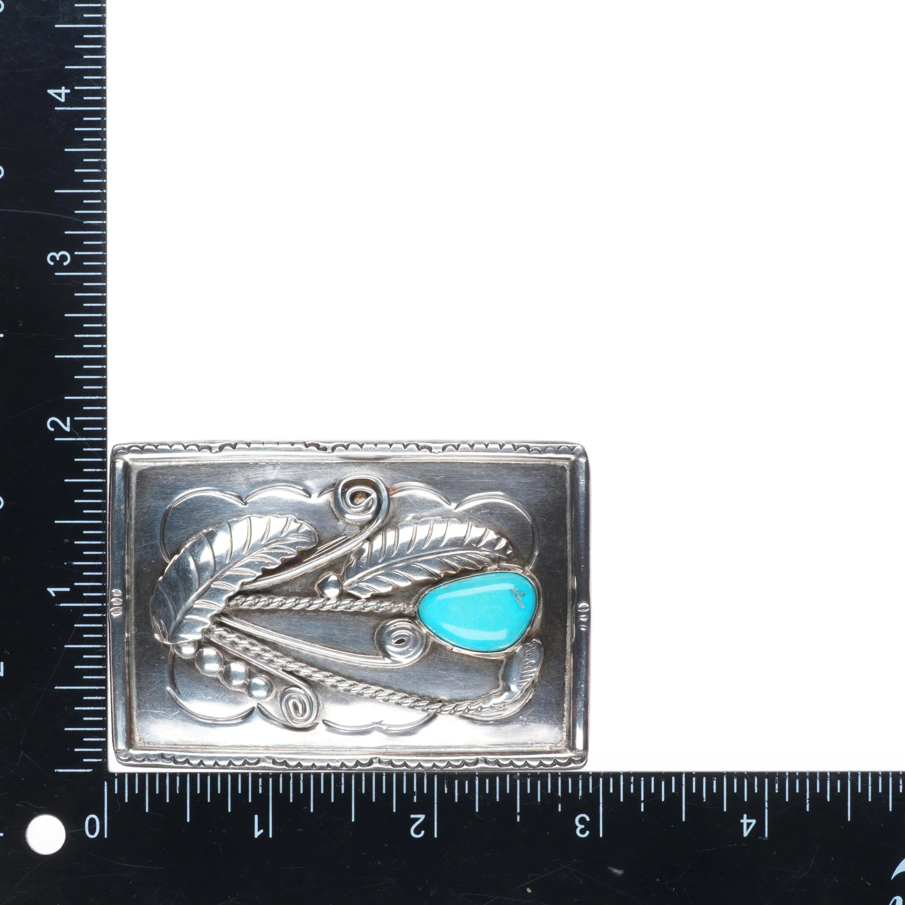 Vintage Navajo sterling silver turquoise belt buckle with turquoise/feathers