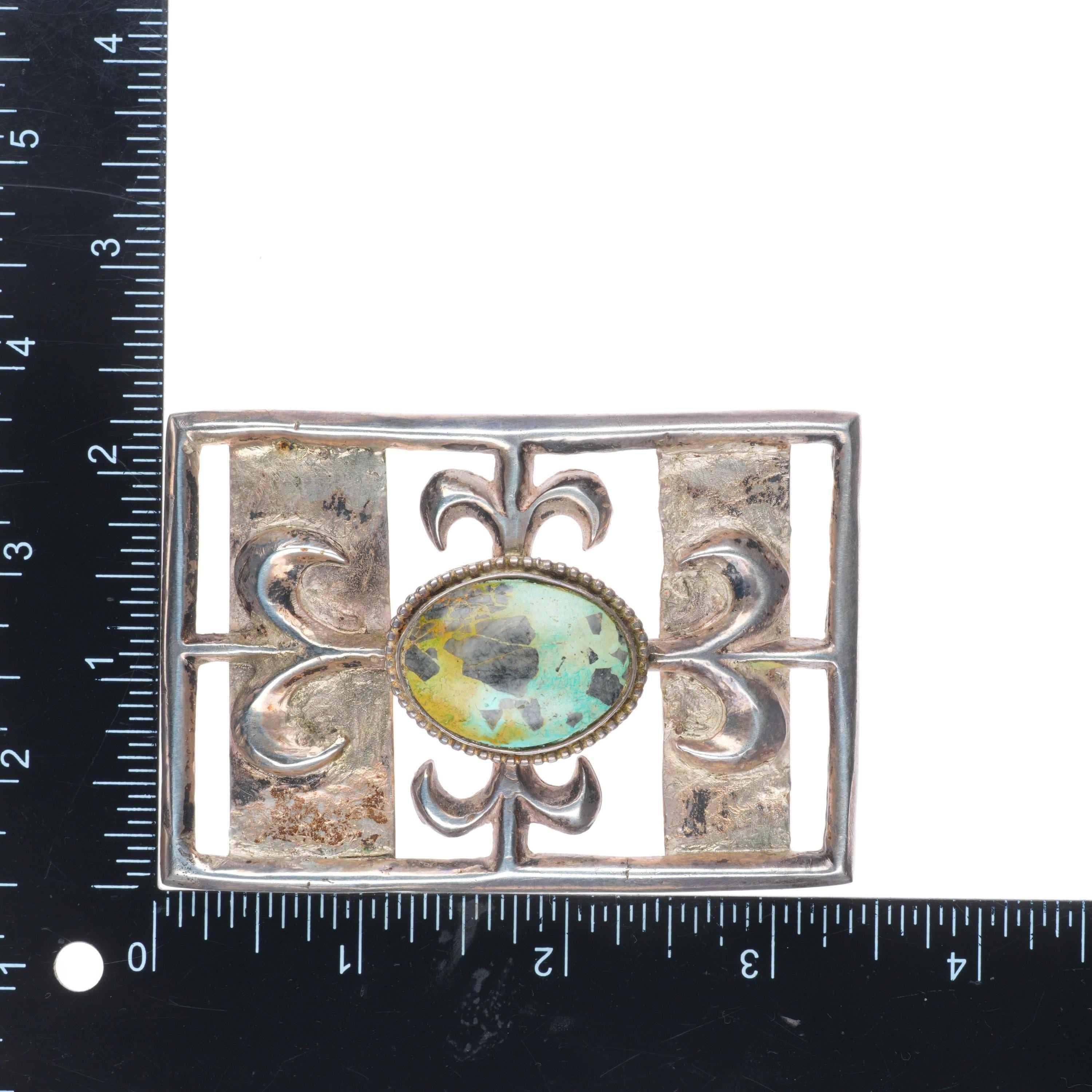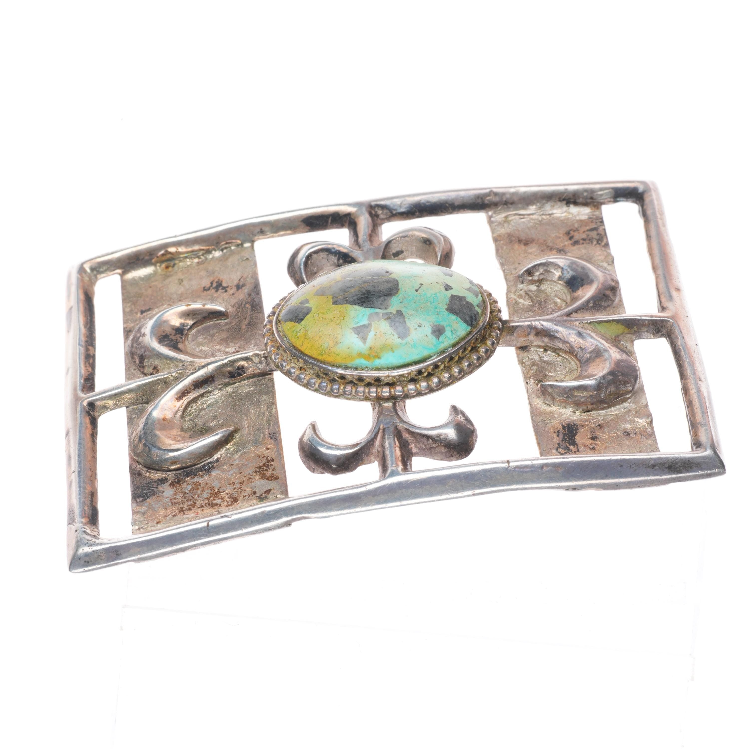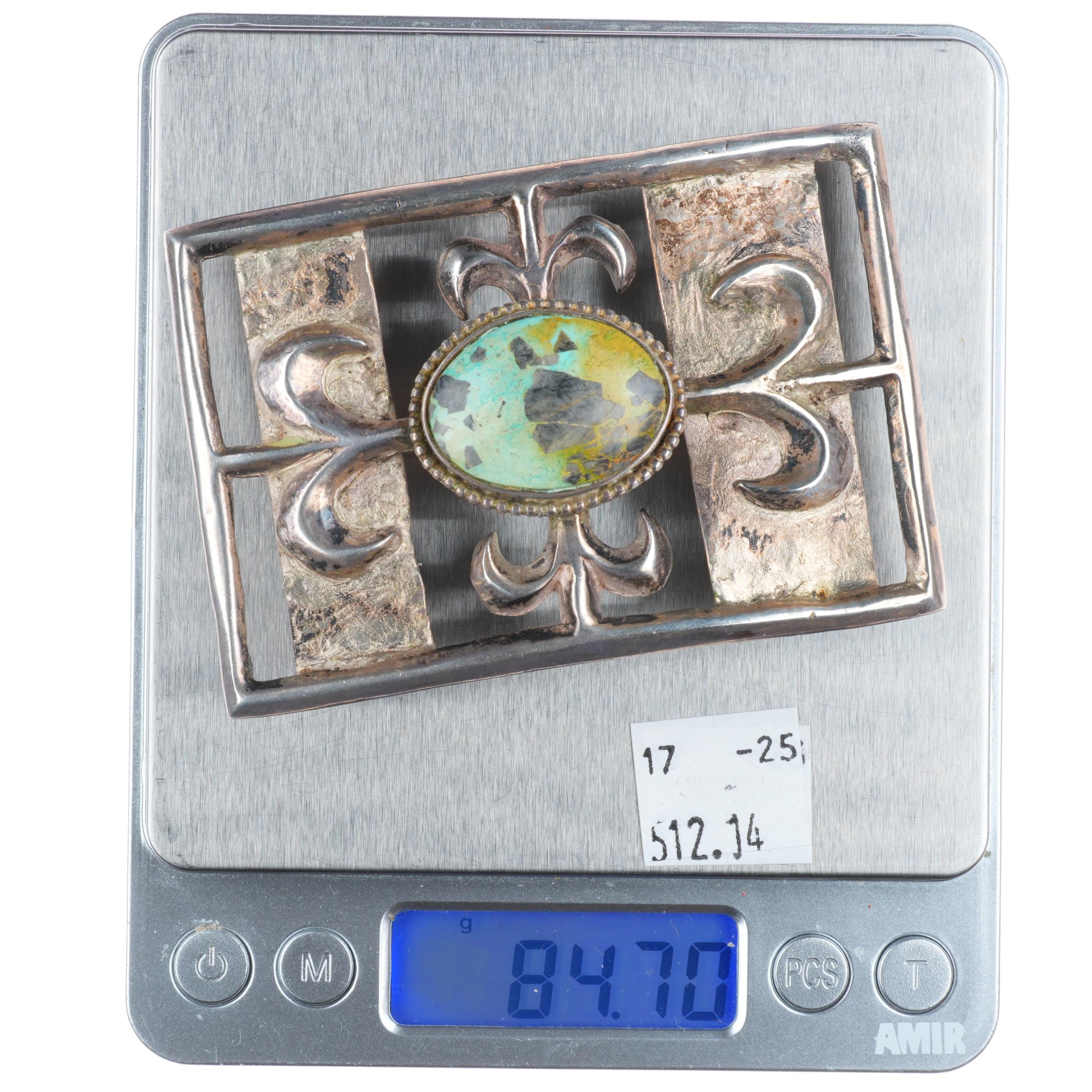 Vintage Navajo Tufa cast sterling silver belt buckle with nice turquoise. Tested and guaranteed solid sterling silver with weight and measurements in pictures. Fully functional. All items will likely have some age appropriate/expected wear, the older they are the more wear they should have. Circa third quarter of the 20th century.. Fits a 1" belt. This was likely an ornament, concho, or similar circa mid 20th century or older later made into a belt buckle.. Numbers engraved on back likely previous owners phone number or id number.