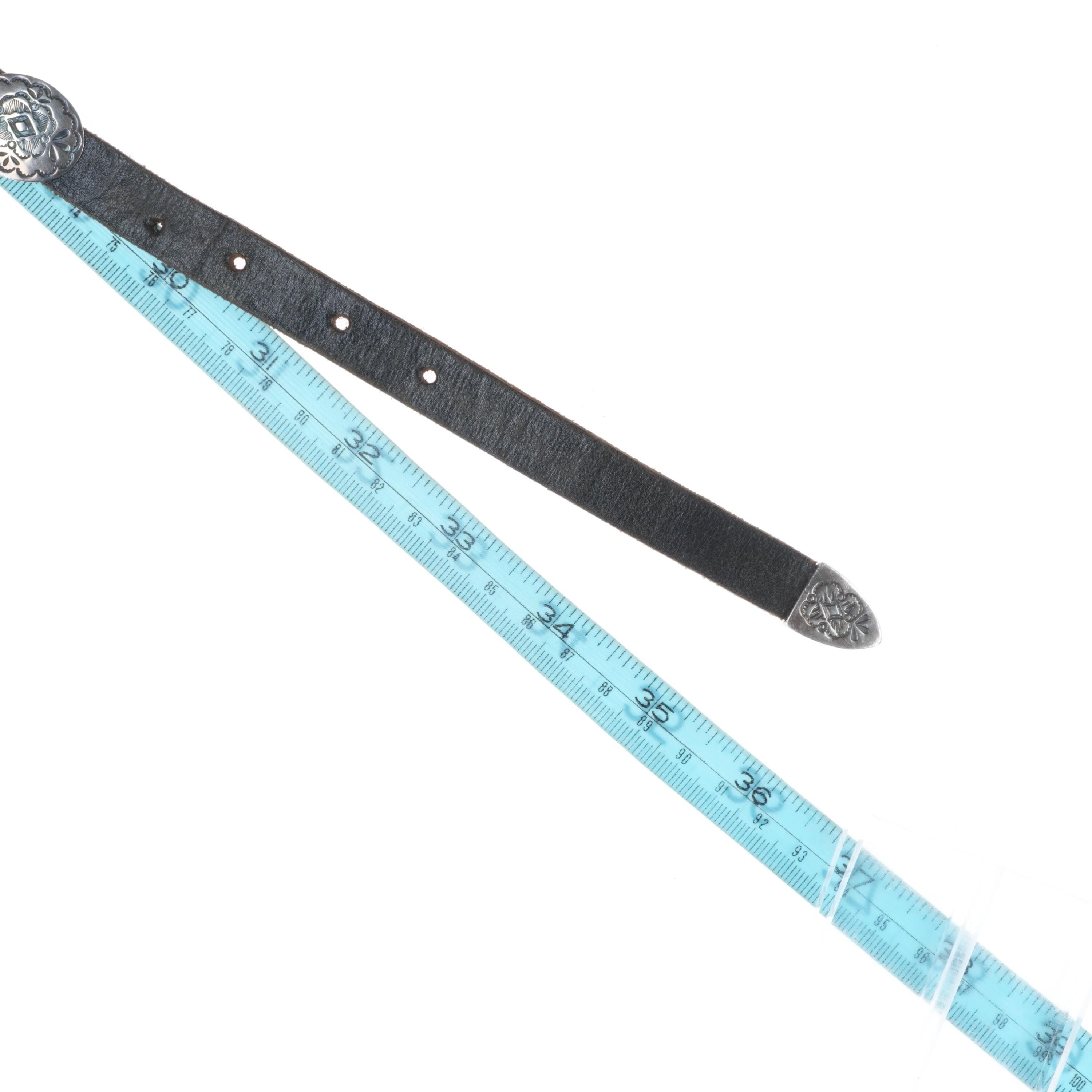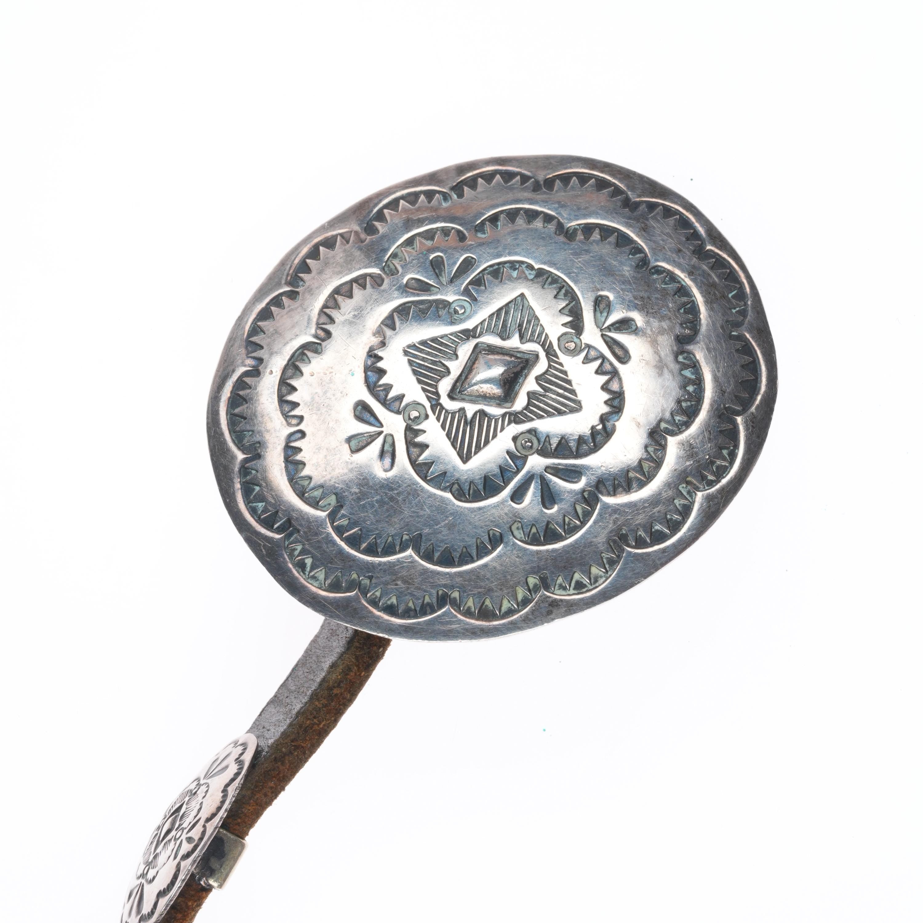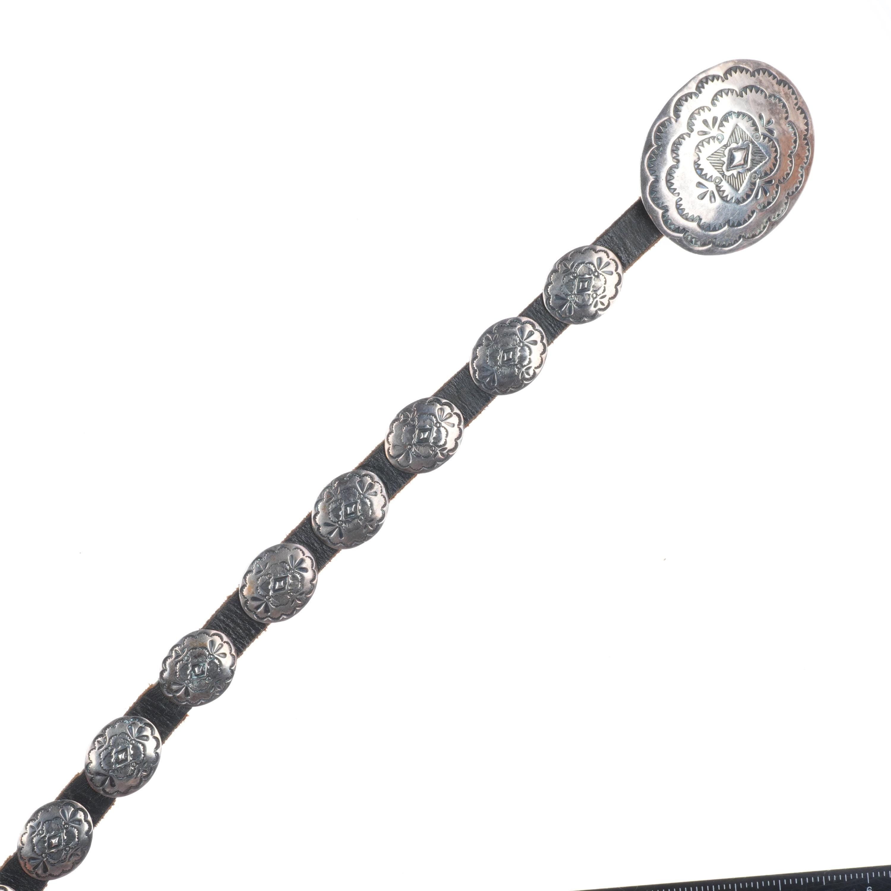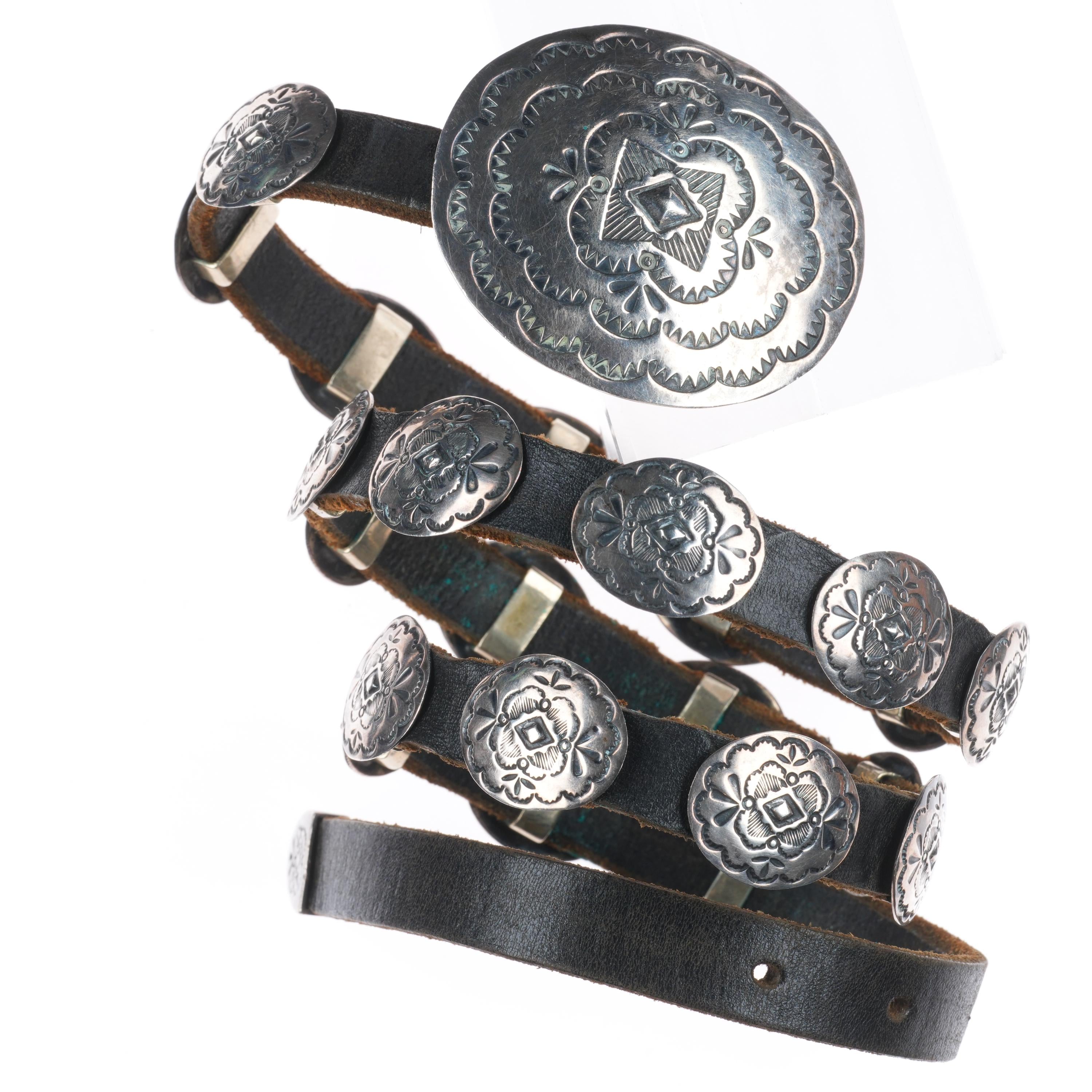 Vintage slim Navajo sterling silver stamped concho belt. Weight and measurements in pictures, will fit up to a 35" waist , existing holes shown with tape measure in photos. 1 buckle, 23 Conchos, all shown in pics.