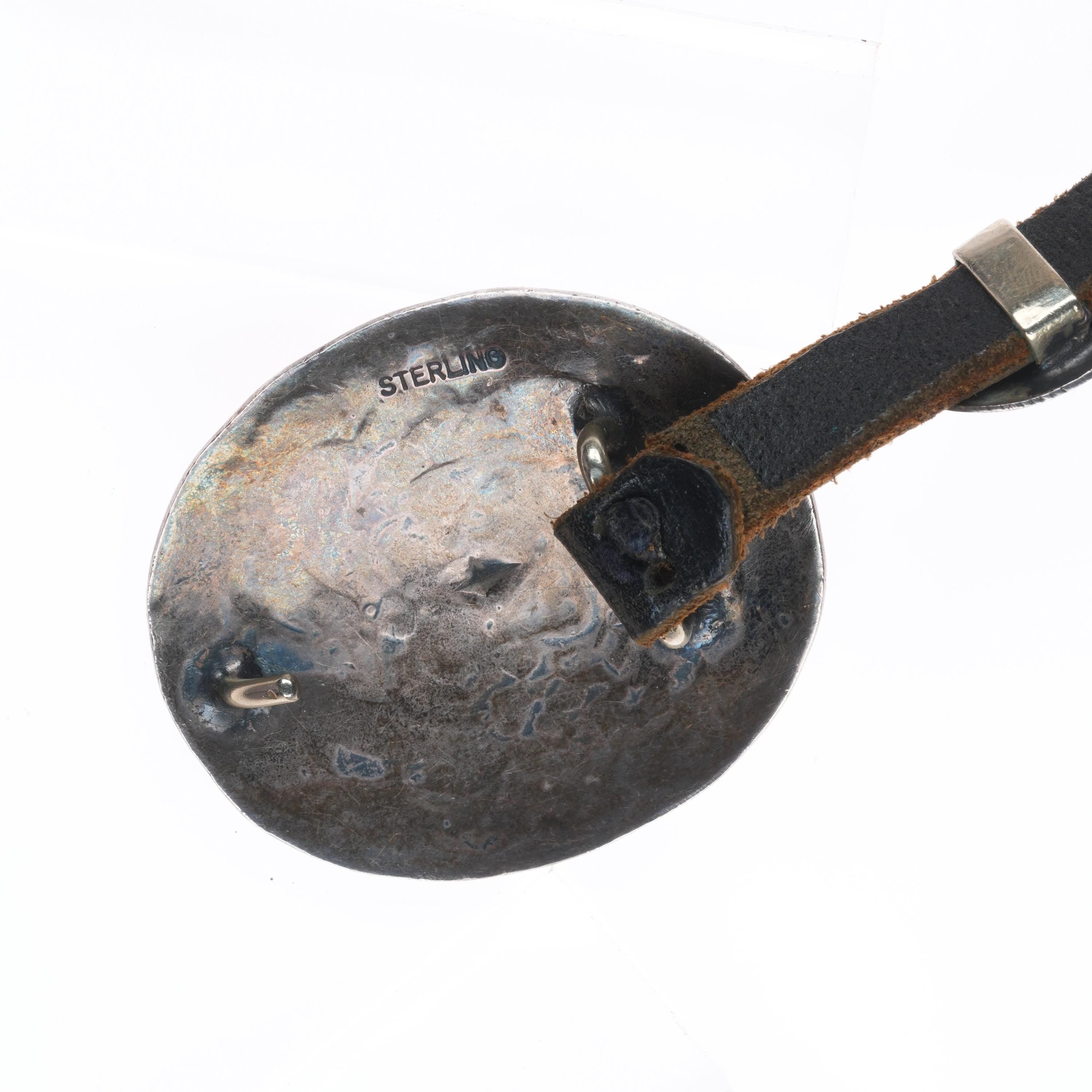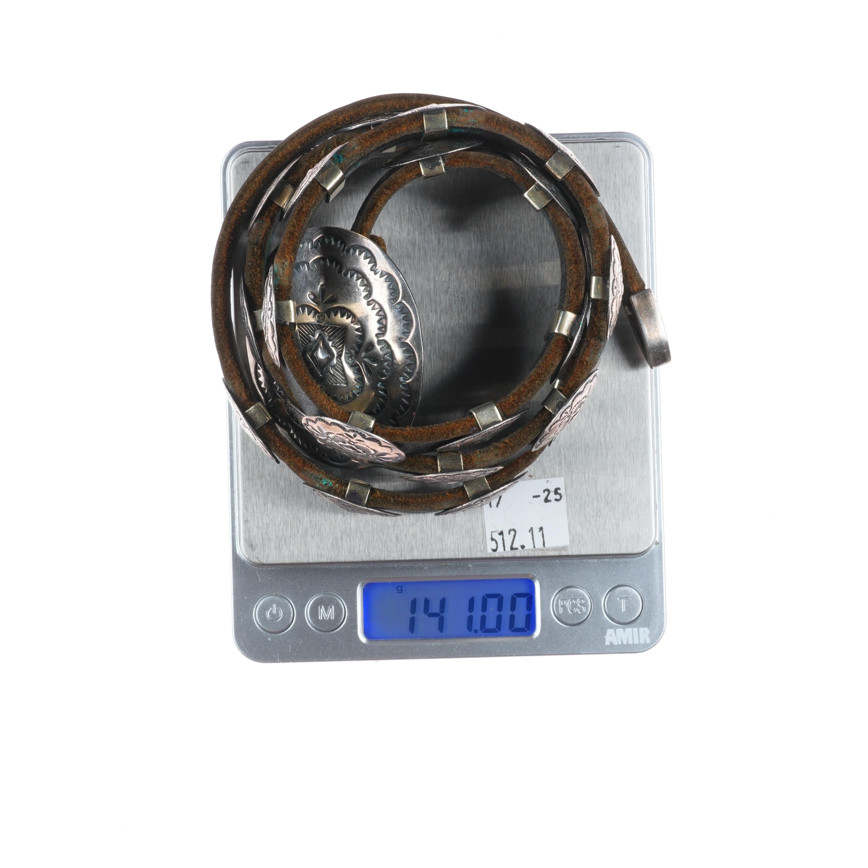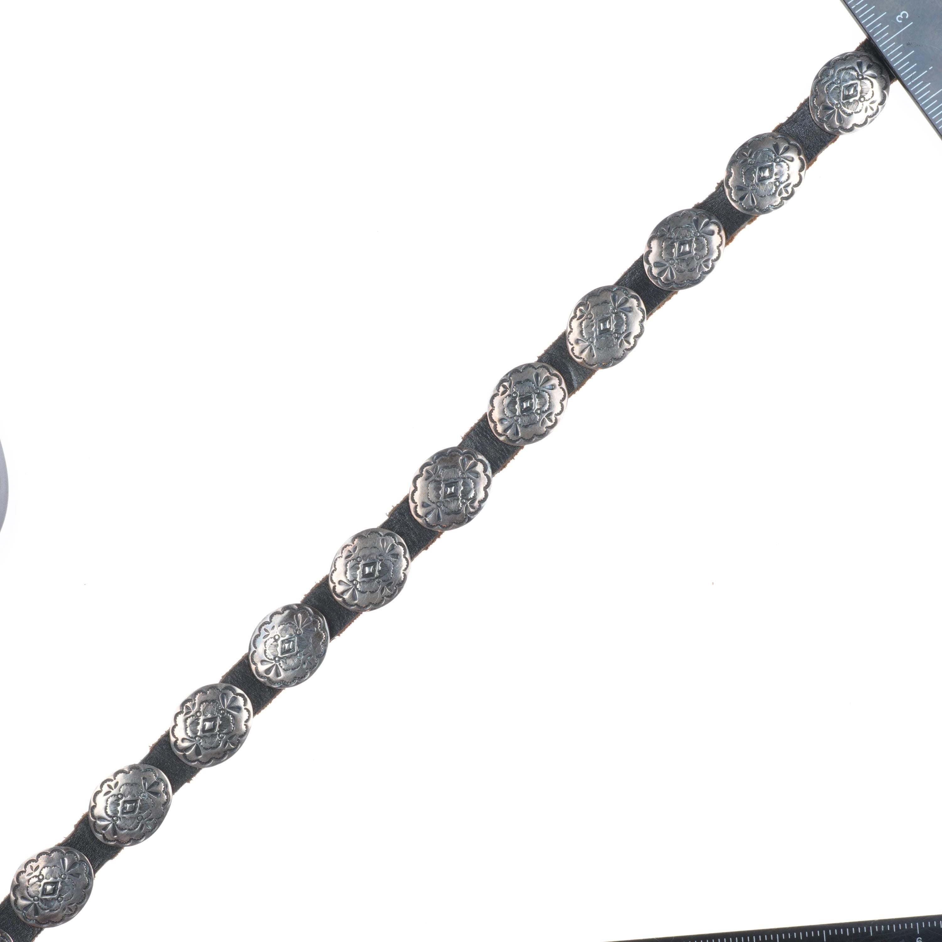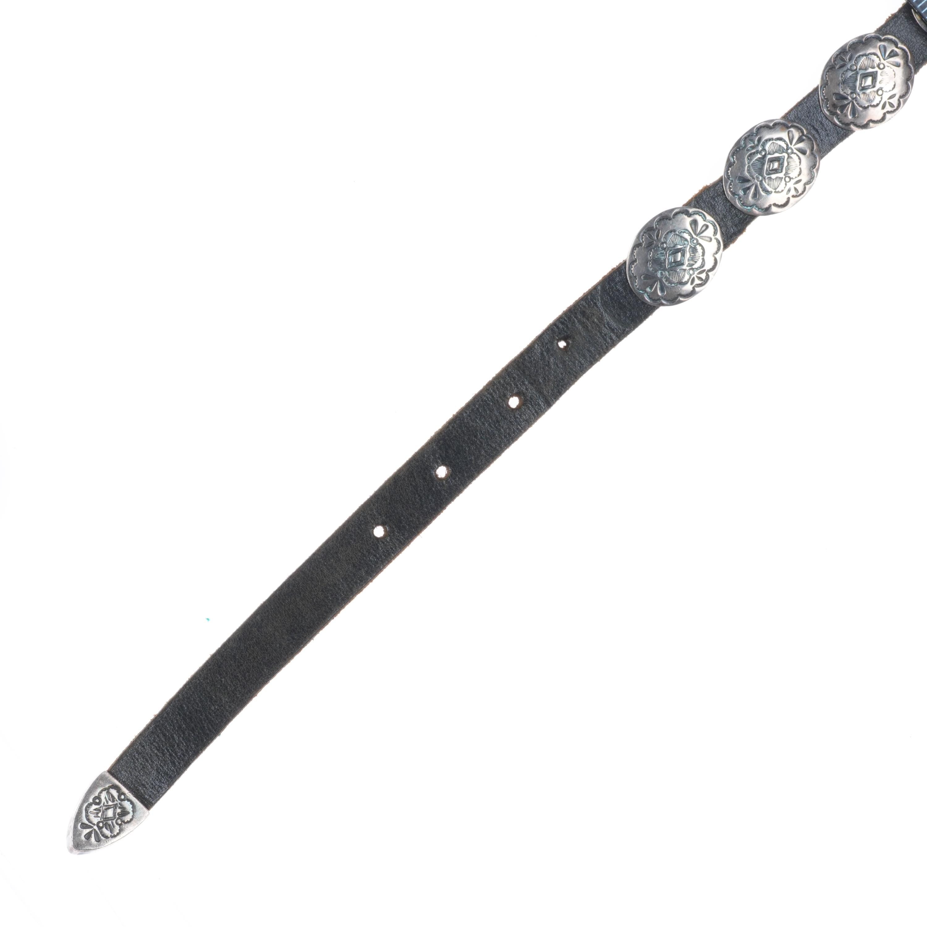Vintage slim Navajo sterling silver stamped concho belt. Weight and measurements in pictures, will fit up to a 35" waist , existing holes shown with tape measure in photos. 1 buckle, 23 Conchos, all shown in pics.
