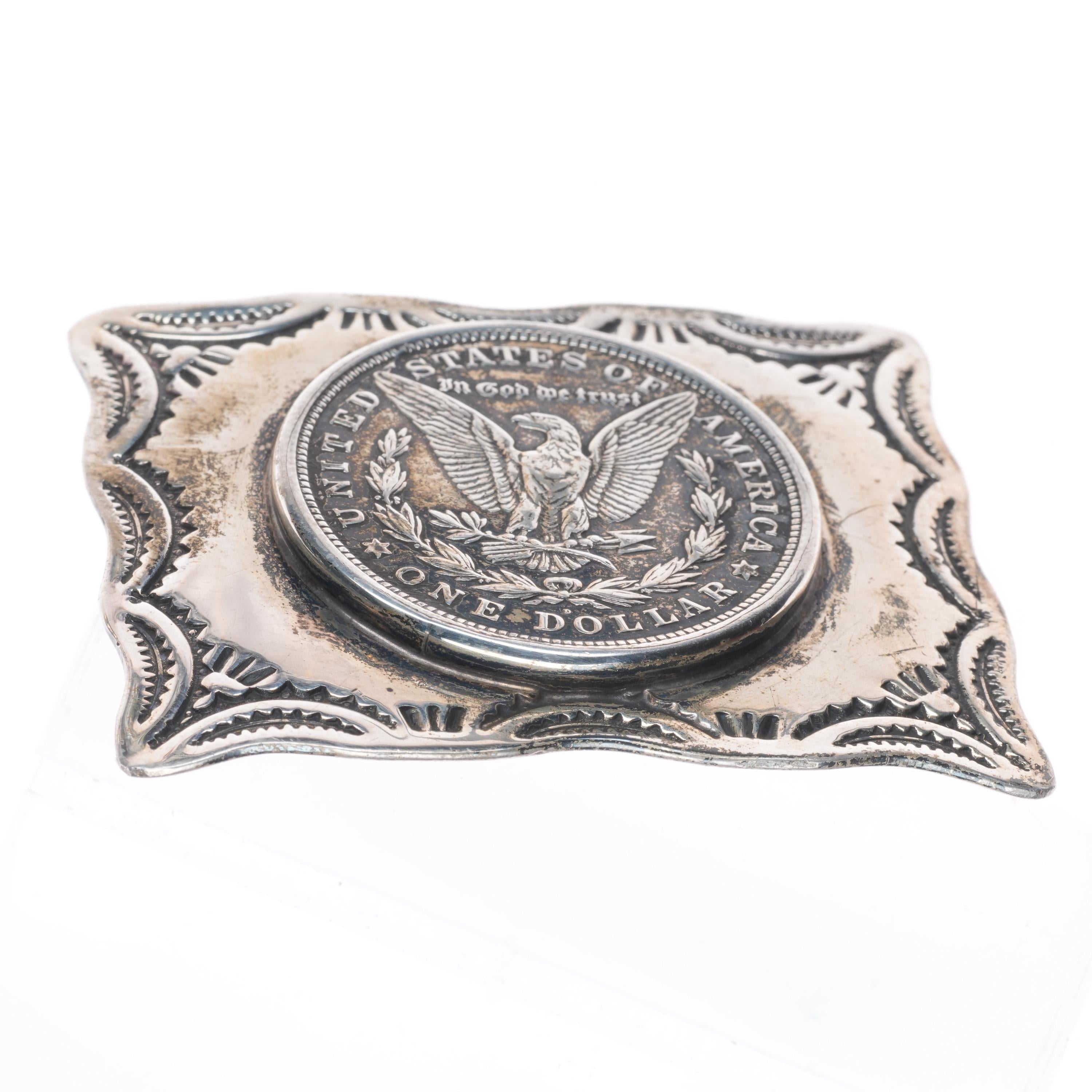 Vintage Southwestern sterling silver hand stamped US Dollar belt buckle. Very clean, possibly unworn. Fits up to a 1" belt, other measurements in pictures. Tested and guaranteed solid sterling silver with 90% silver US coin.