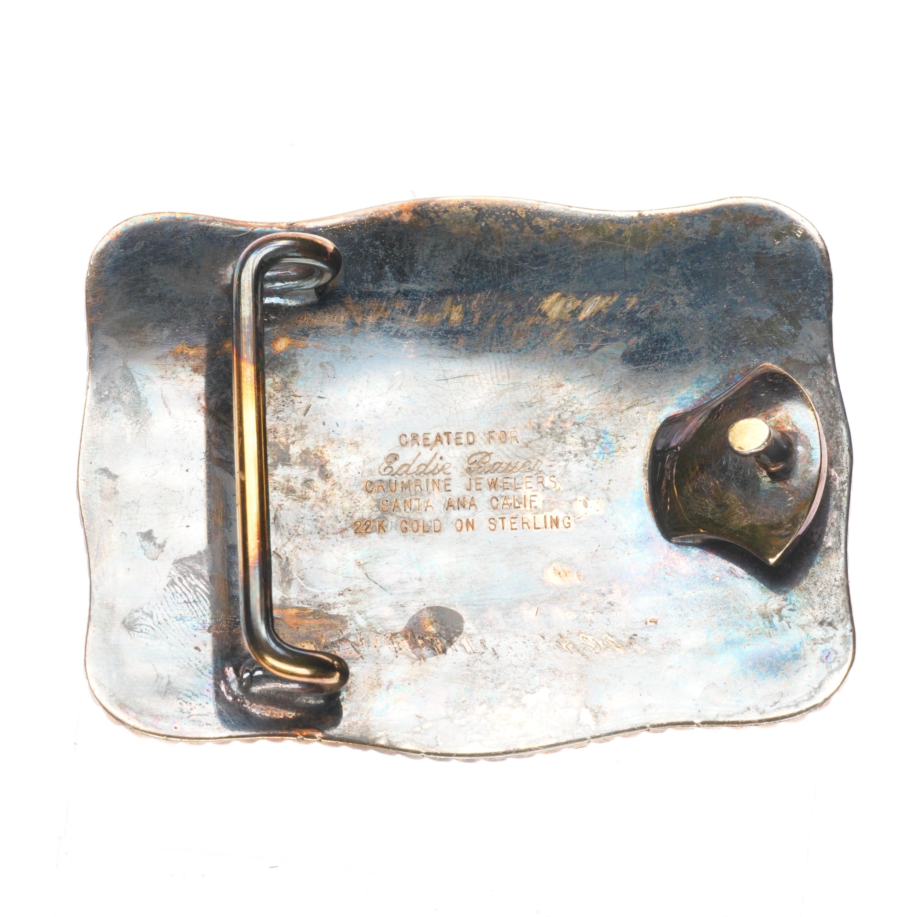 Vintage Sterling silver Eddie Bauer Crumrine gold plated deer belt buckle. Tested and guaranteed solid sterling silver with, weight and measurements in pictures with some expected wear, fully functional. Some wear to gold plating, no other issues.